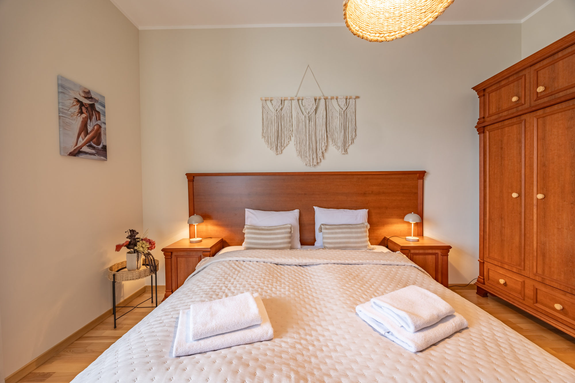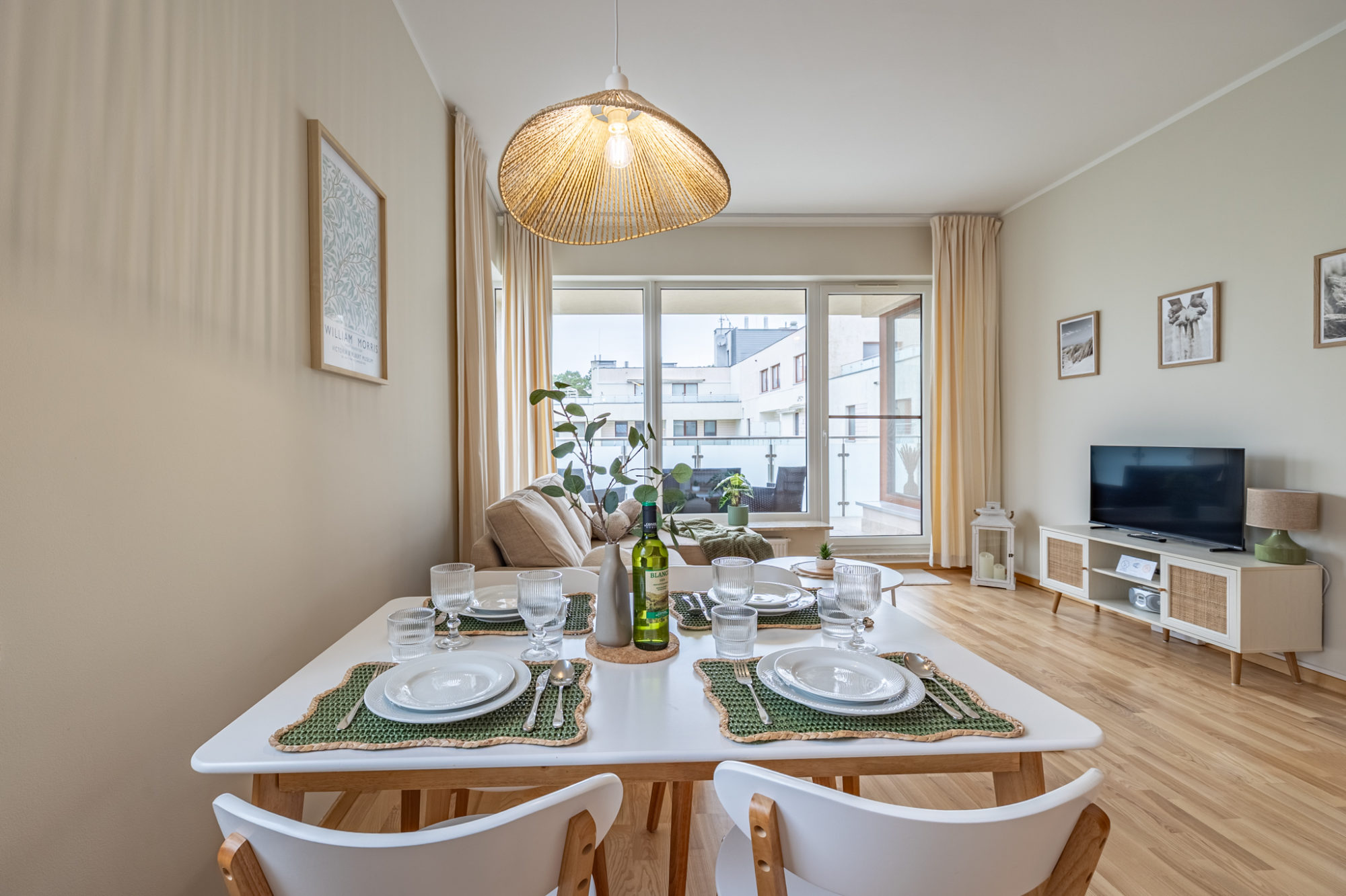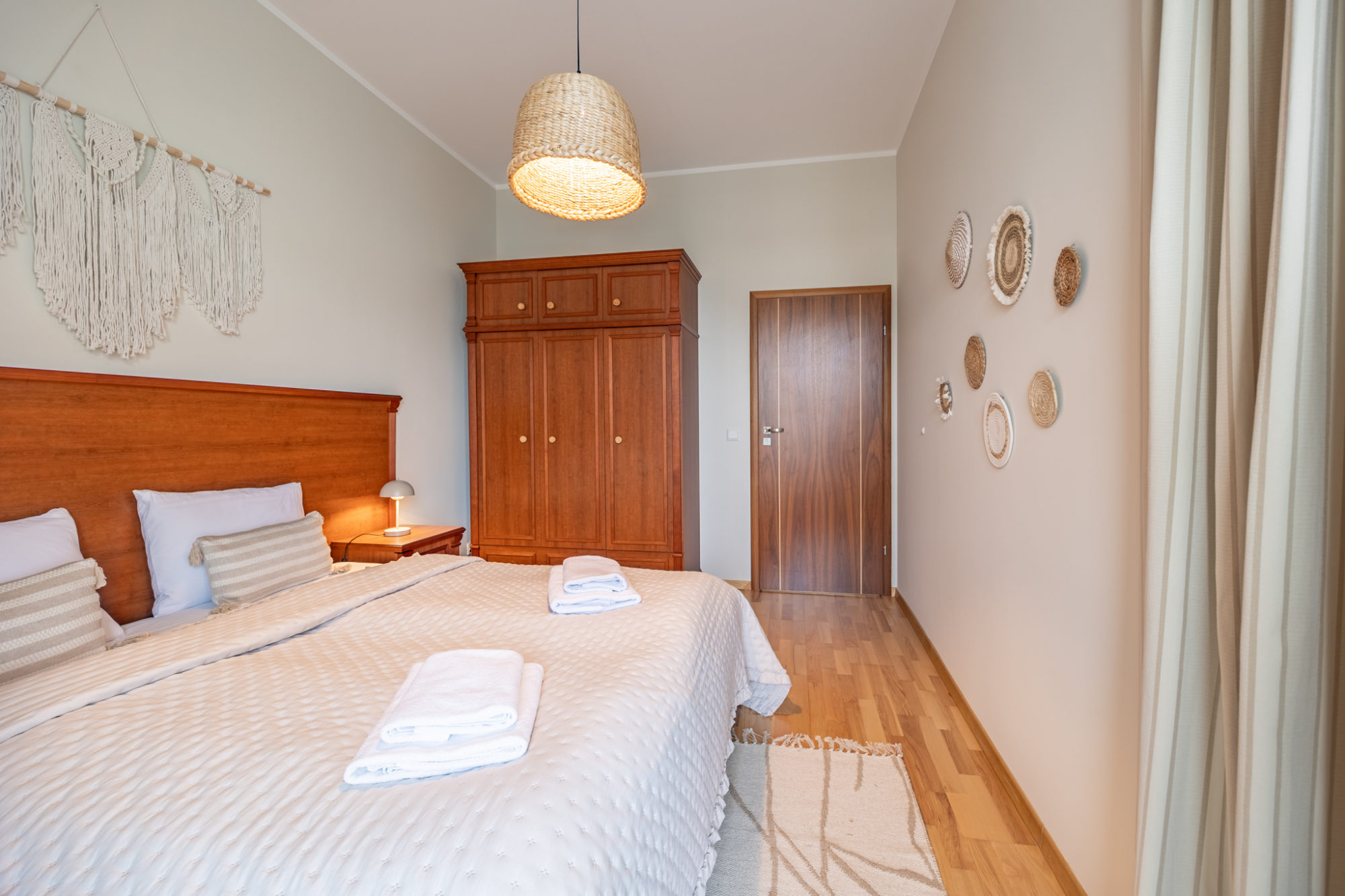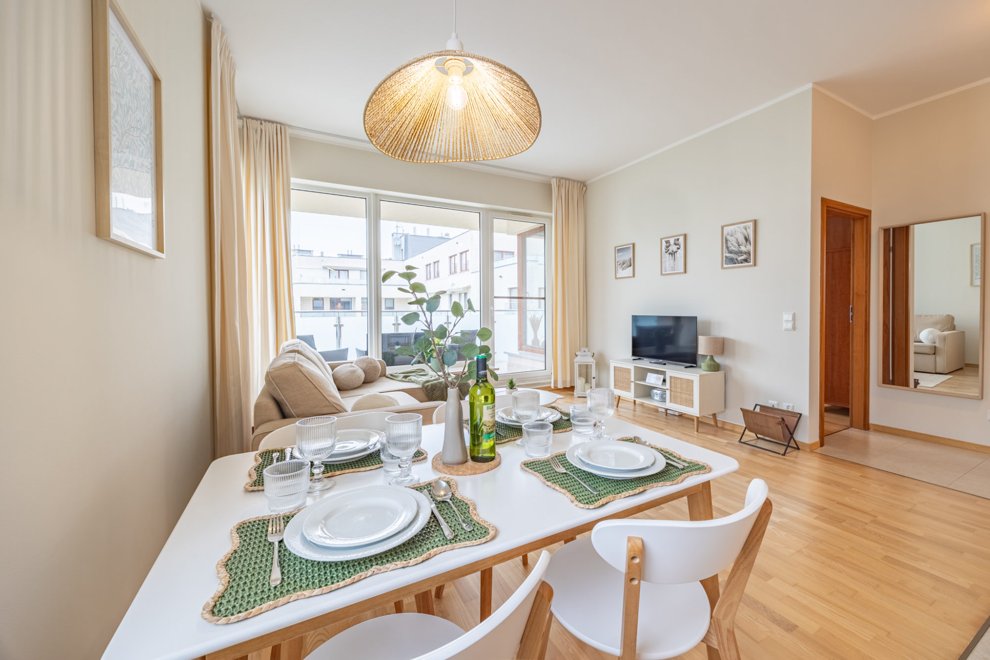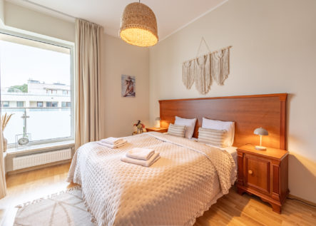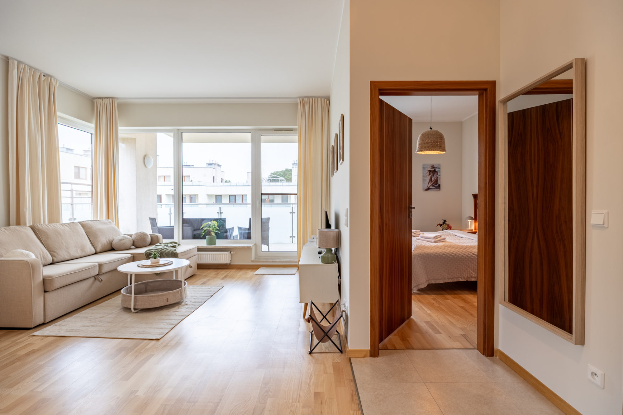 Do dyspozycji gości są 2 pokoje (niezależna sypialnia i otwarty salon), aneks kuchenny, przestronna łazienka oraz duży balkon. W kuchni znajduje się płyta elektryczna, lodówka z zamrażalnikiem, kuchenka mikrofalowa, czajnik elektryczny, ekspres do kawy, niezbędne naczynia oraz stół i krzesła dla czterech osób. W salonie znajduje się rozkładana sofa z funkcją spania oraz telewizor z płaskim ekranem. Sypialnię wyposażono w wygodne łóżko dla 2 osób.