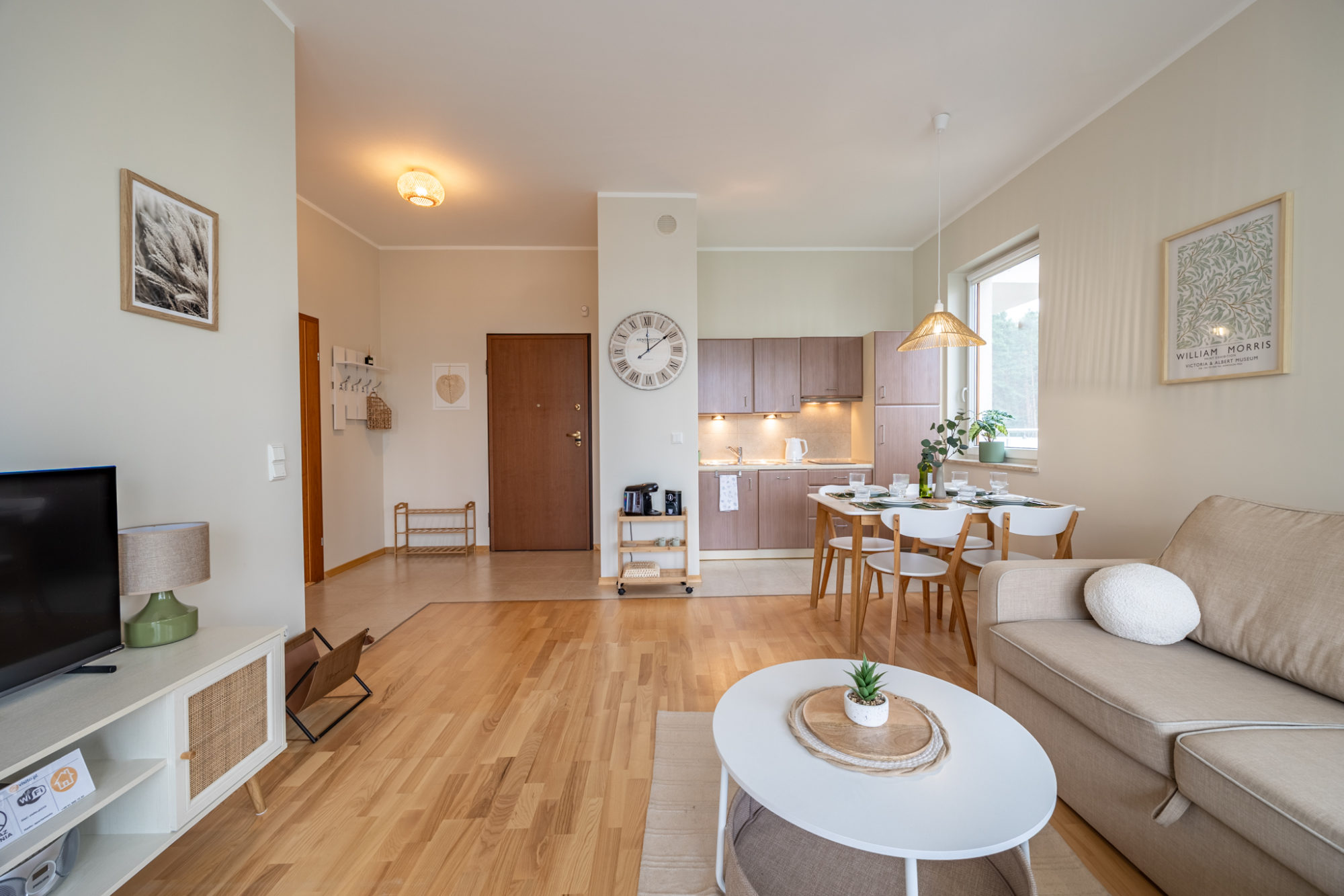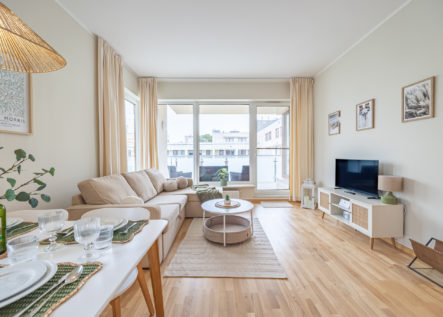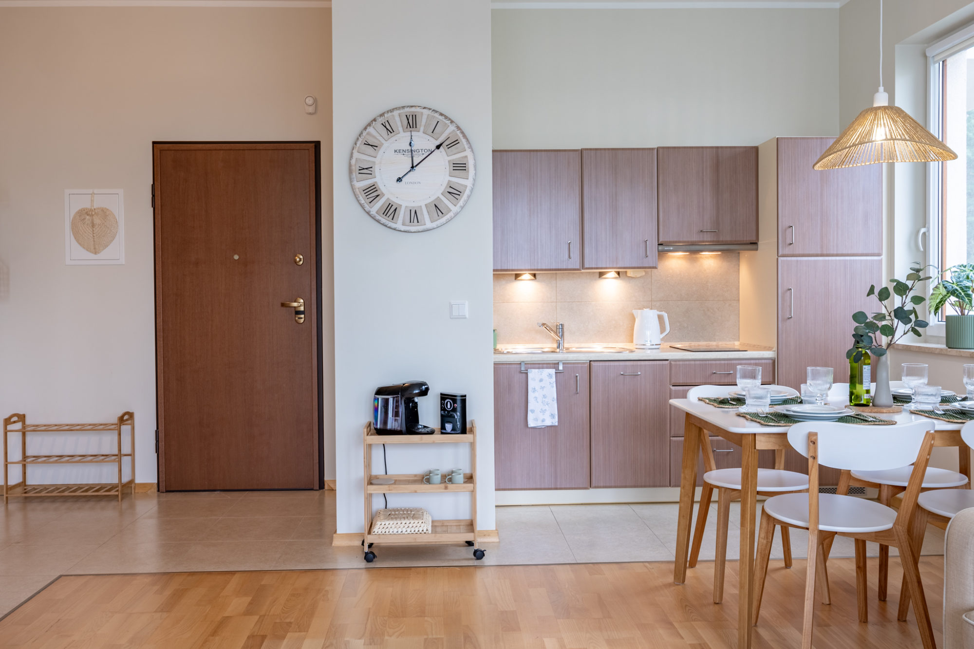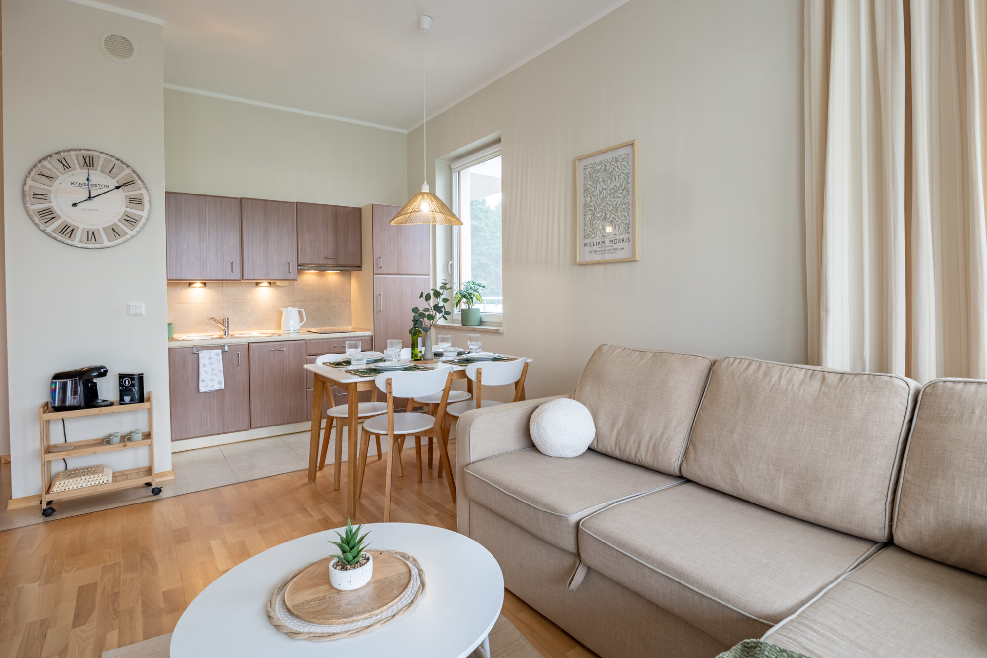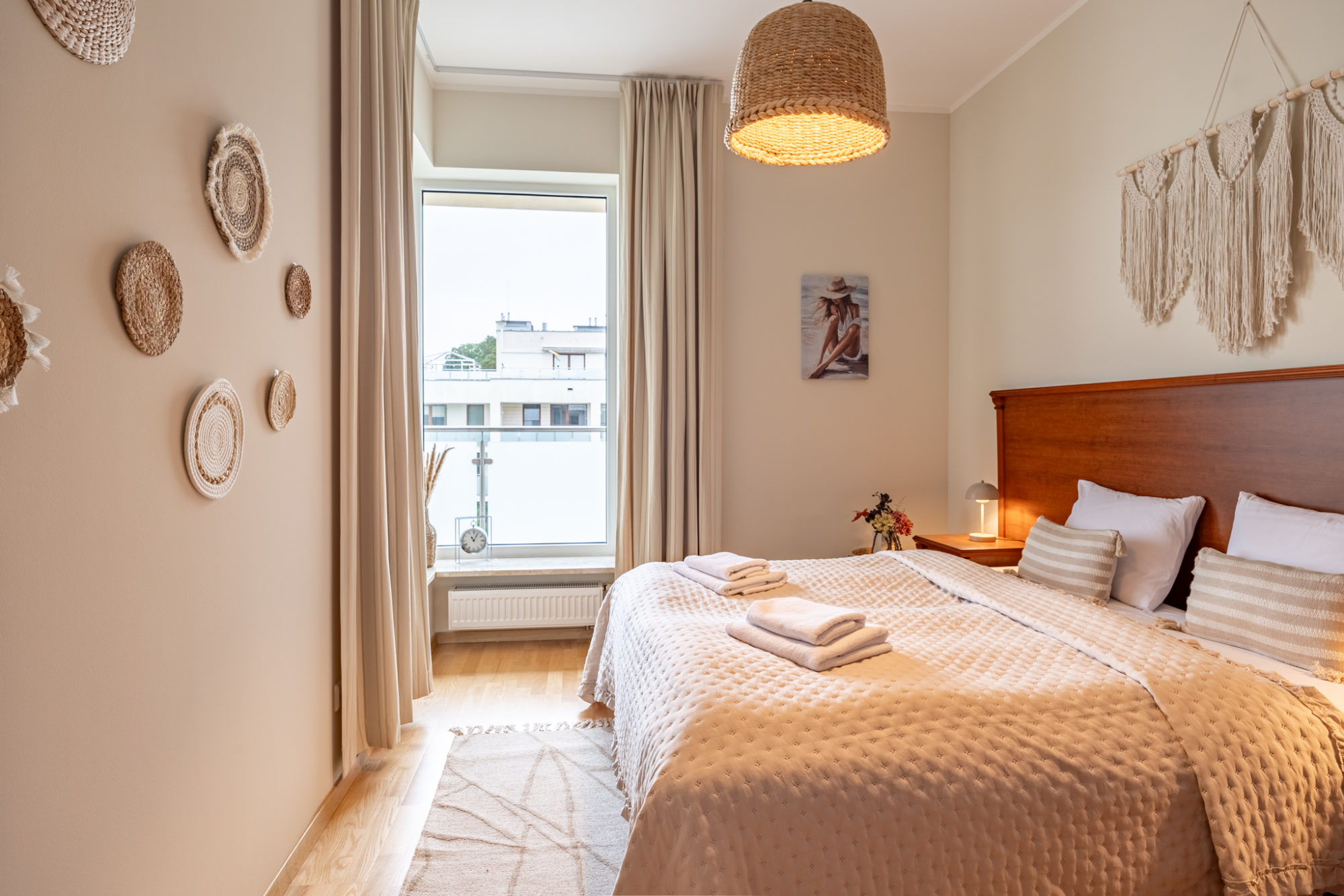 Do dyspozycji gości są 2 pokoje (niezależna sypialnia i otwarty salon), aneks kuchenny, przestronna łazienka oraz duży balkon. W kuchni znajduje się płyta elektryczna, lodówka z zamrażalnikiem, kuchenka mikrofalowa, czajnik elektryczny, ekspres do kawy, niezbędne naczynia oraz stół i krzesła dla czterech osób. W salonie znajduje się rozkładana sofa z funkcją spania oraz telewizor z płaskim ekranem. Sypialnię wyposażono w wygodne łóżko dla 2 osób.
