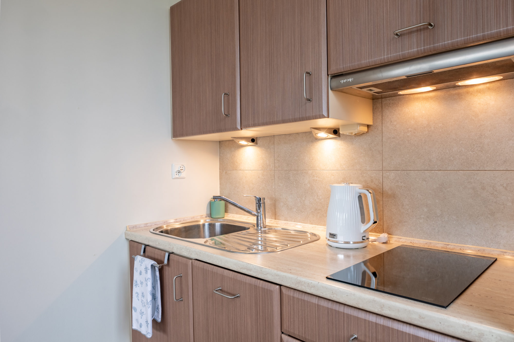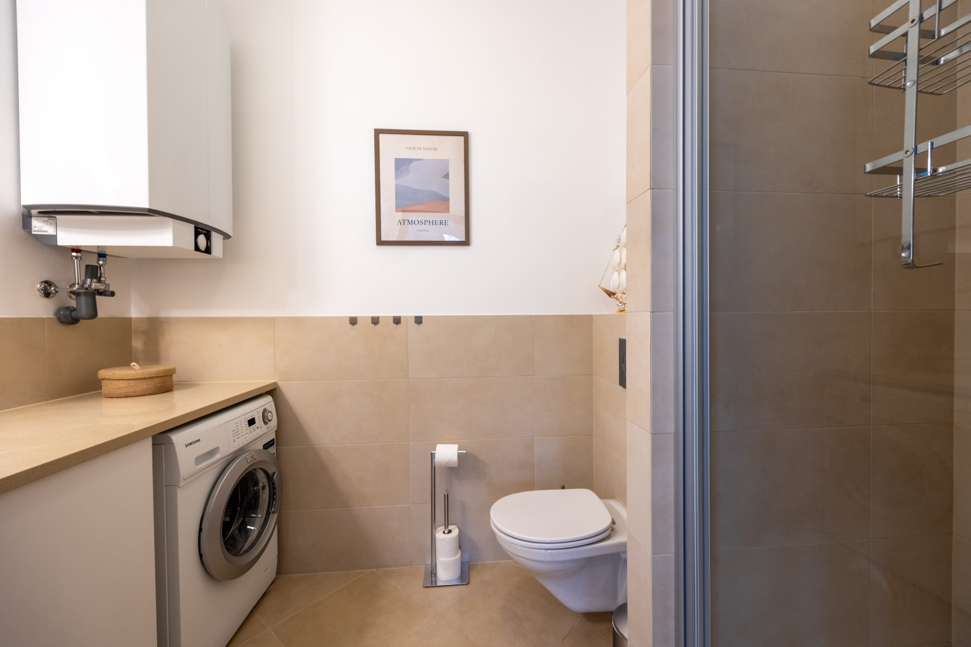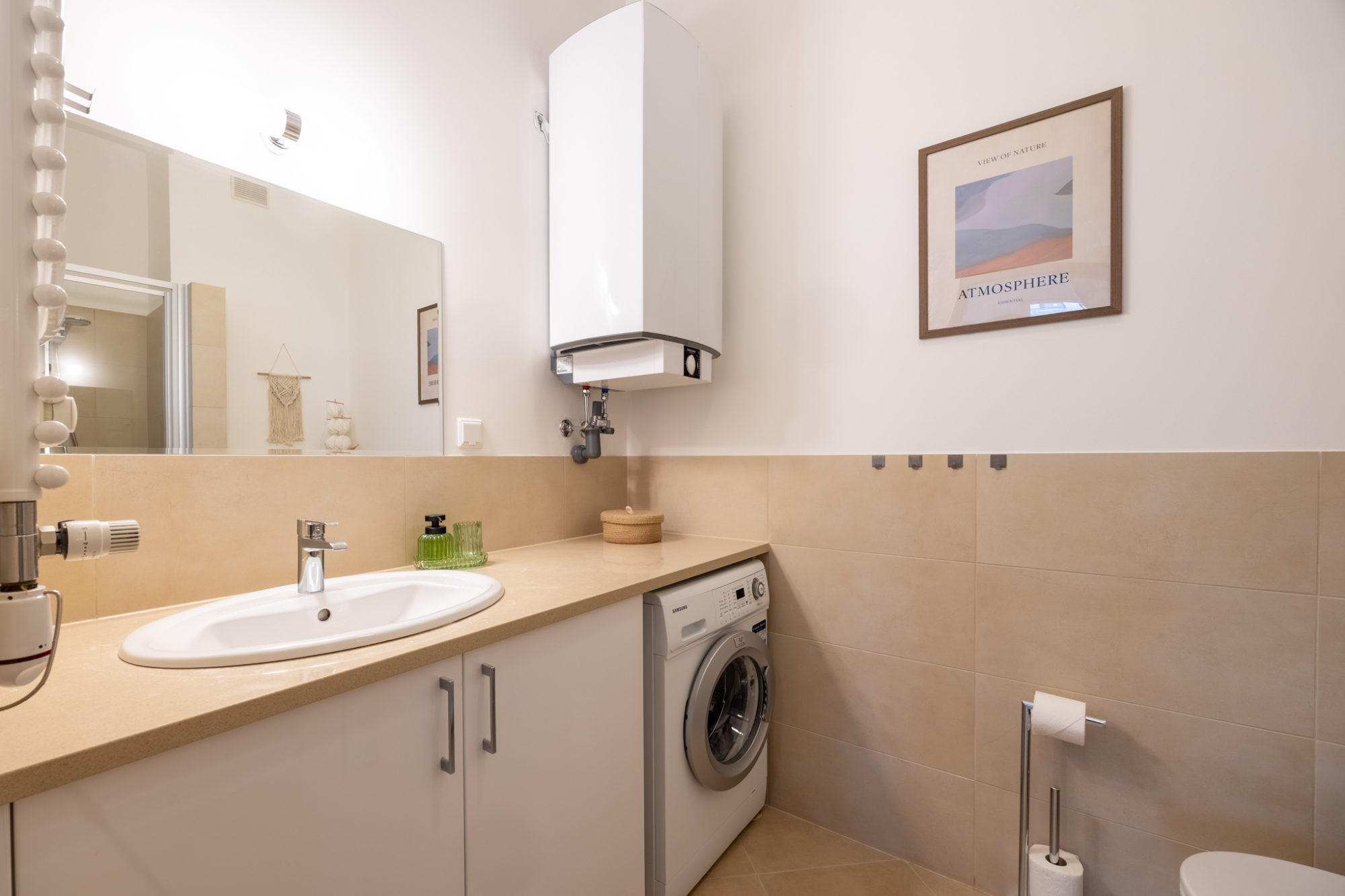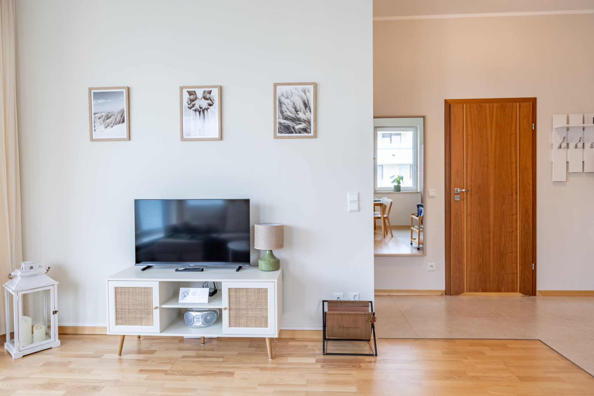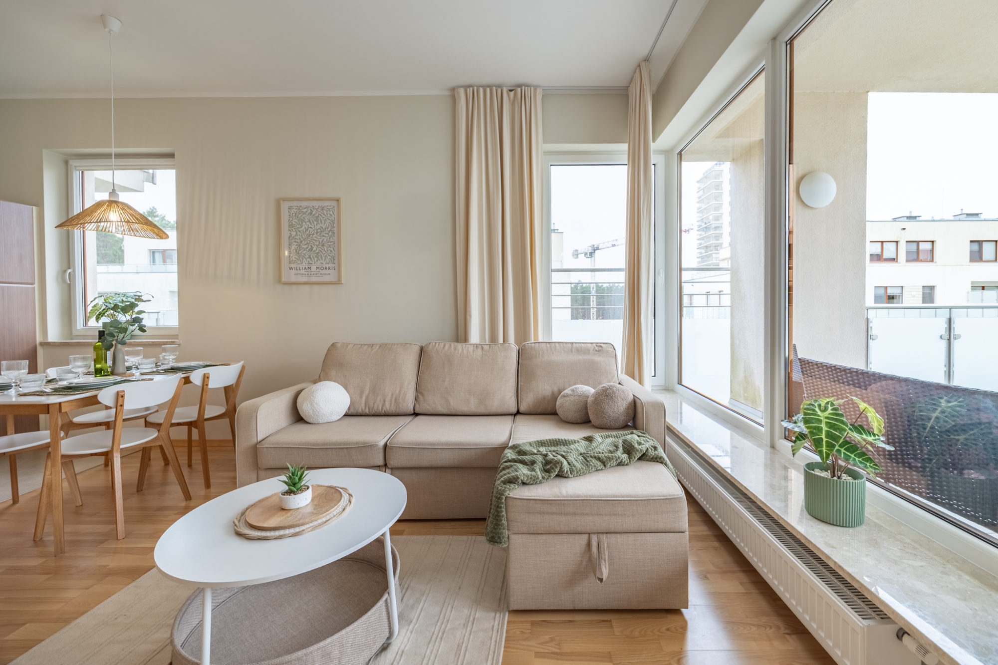 Do dyspozycji gości są 2 pokoje (niezależna sypialnia i otwarty salon), aneks kuchenny, przestronna łazienka oraz duży balkon. W kuchni znajduje się płyta elektryczna, lodówka z zamrażalnikiem, kuchenka mikrofalowa, czajnik elektryczny, ekspres do kawy, niezbędne naczynia oraz stół i krzesła dla czterech osób. W salonie znajduje się rozkładana sofa z funkcją spania oraz telewizor z płaskim ekranem. Sypialnię wyposażono w wygodne łóżko dla 2 osób.