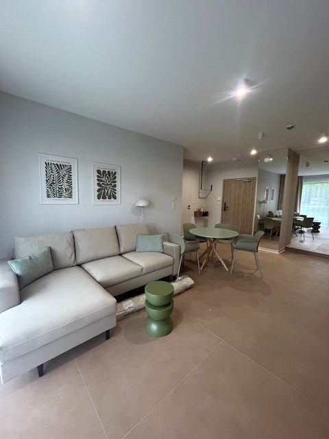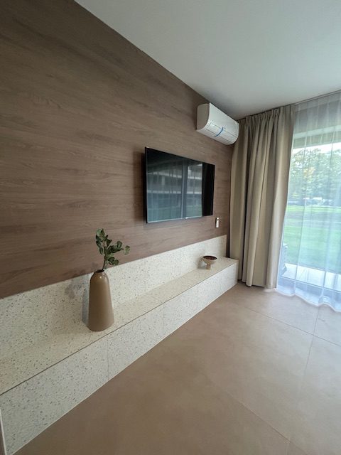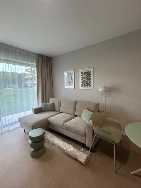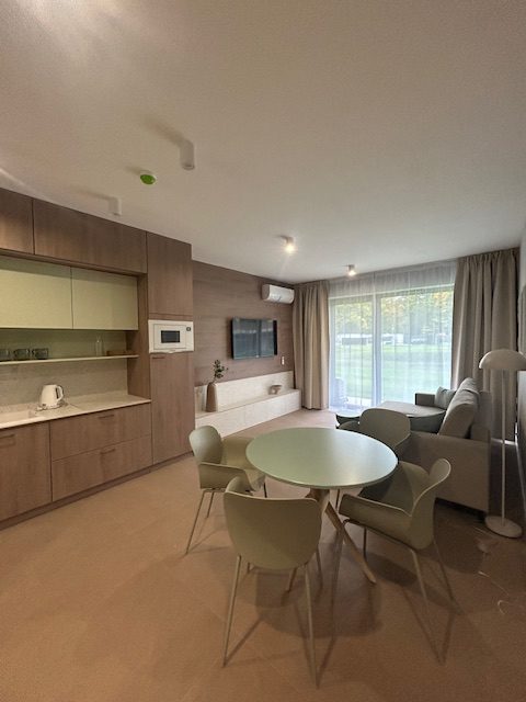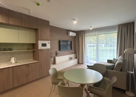 Apartament 2-pokojowy położony jest na parterze, składa się z salonu połączonego z aneksem kuchennym, który jest w pełni wyposażony (lodówka, 2 palnikowa płyta elektryczna, zmywarka do naczyń, ekspres do kawy, czajnik elektryczny), sypialni (łóżko 2-osobowe) i łazienki z kabiną prysznicową. Dużą zaletą prezentowanego apartamentu jest przestronny taras, z pięknym widokiem na zieleń. Dodatkowe wyposażenie to tv z płaskim ekranem, żelazko, deska do prasowania, suszarka do włosów, suszarka do bielizny. W obrębie mieszkania można korzystać z bezprzewodowego internetu.