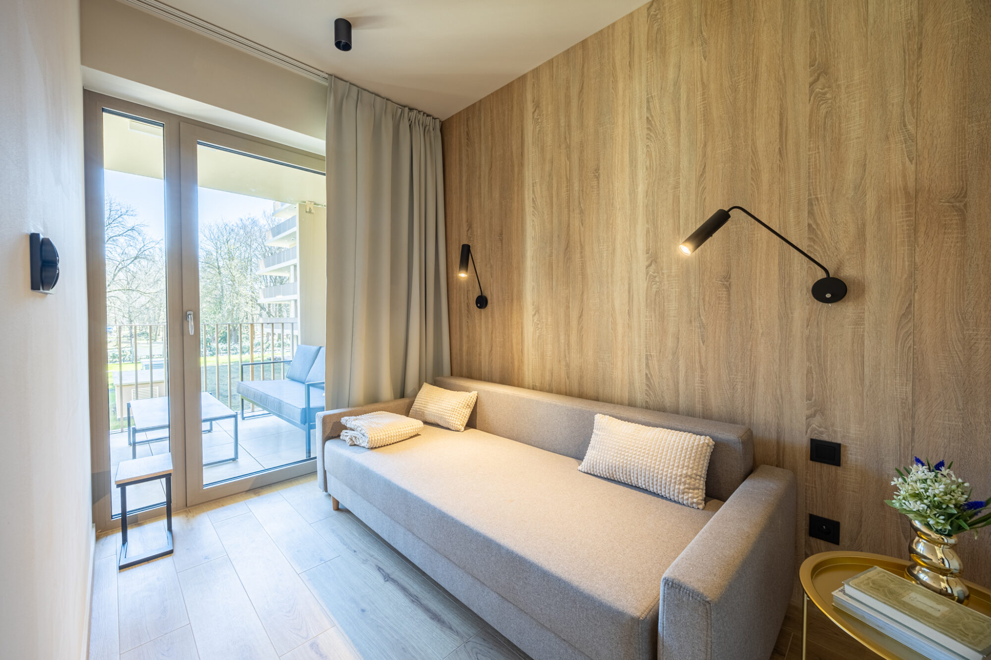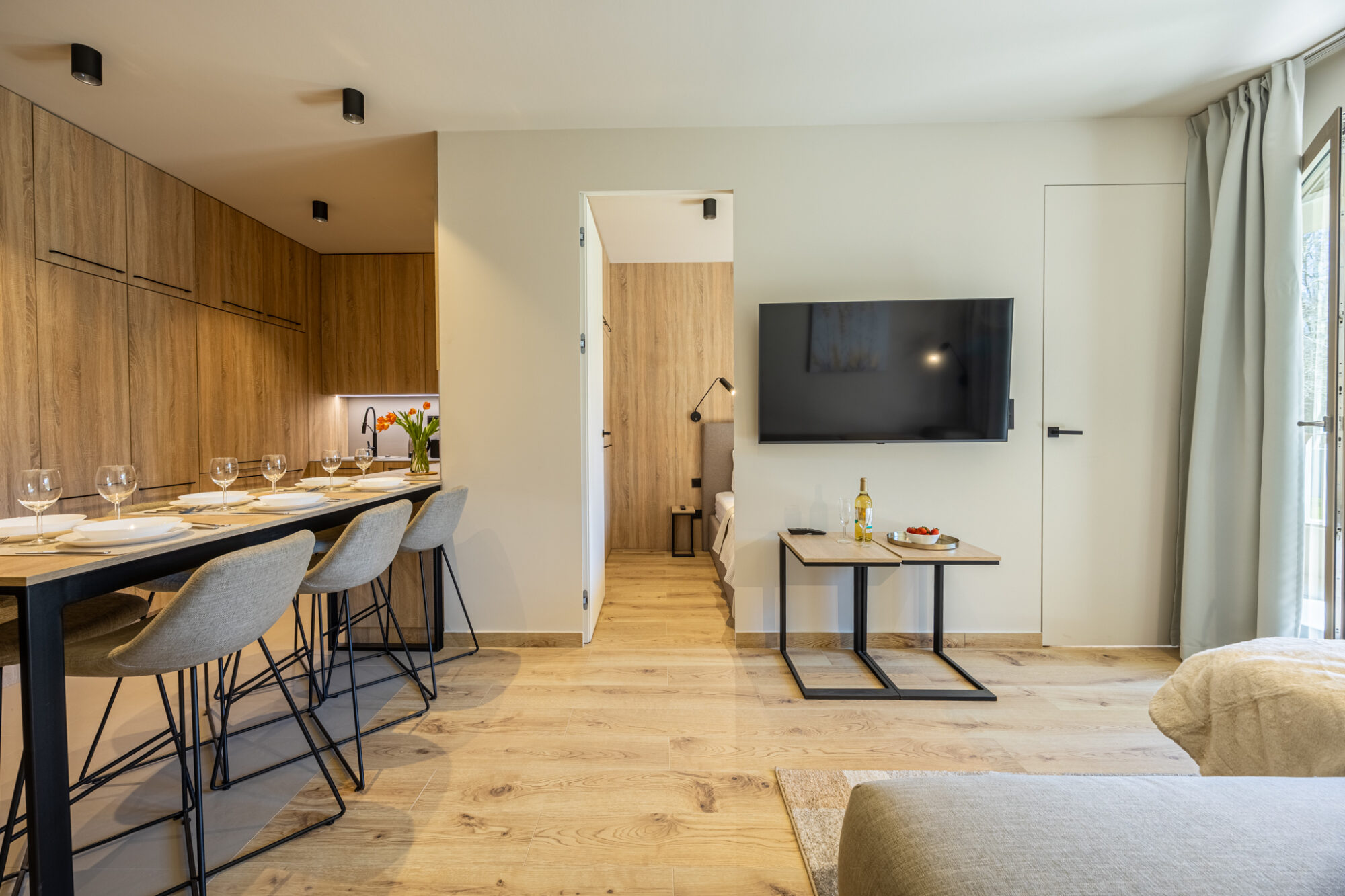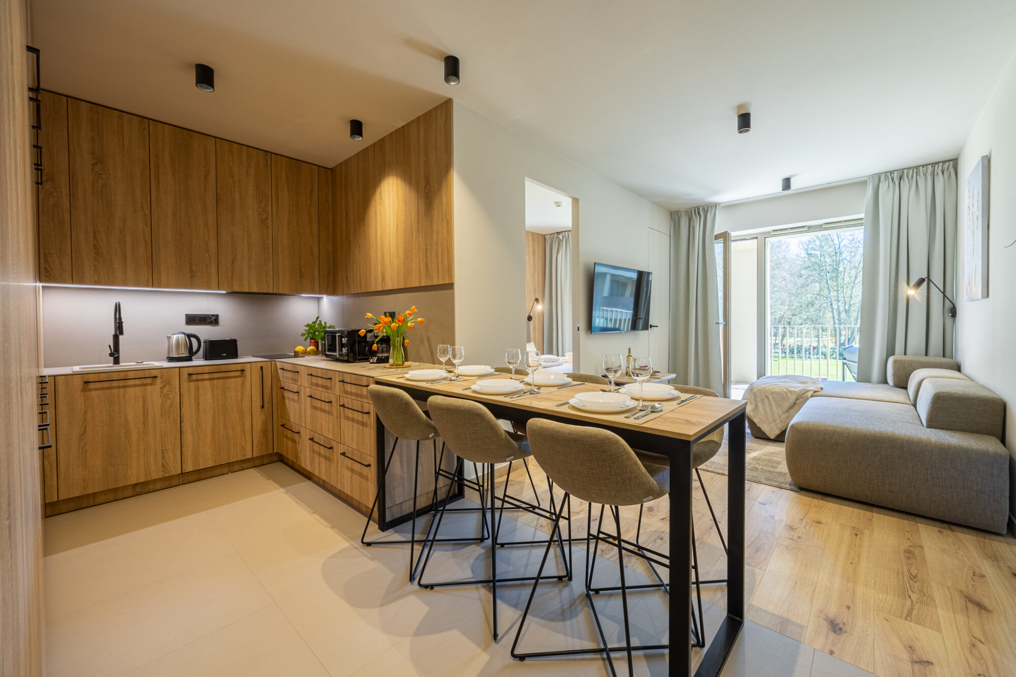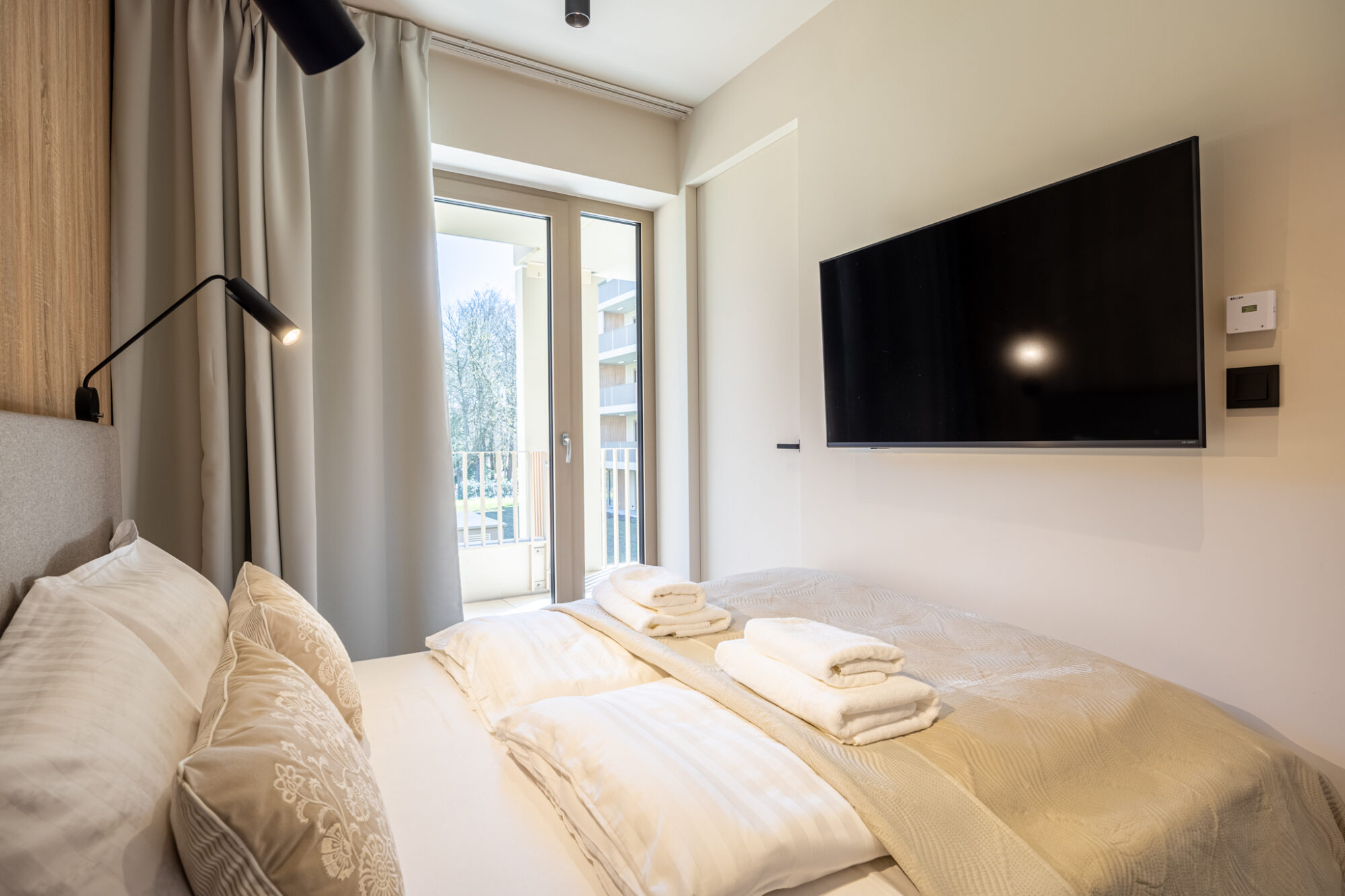 Komfortowy apartament, urządzony w nowoczesnym stylu, w pełni wyposażony zapewnia znakomite warunki do rodzinnego wypoczynku. Apartament składa się z salonu połączonego z kuchnią, która jest kompleksowo wyposażona (zmywarka do naczyń, lodówka, płyta elektryczna, czajnik elektryczny, toster, ekspres do kawy itp.), 2 sypialni (jedna z dużym łóżkiem, druga z sofą rozkładaną) i łazienki. Do apartamentu przynależy przestronny balkon.