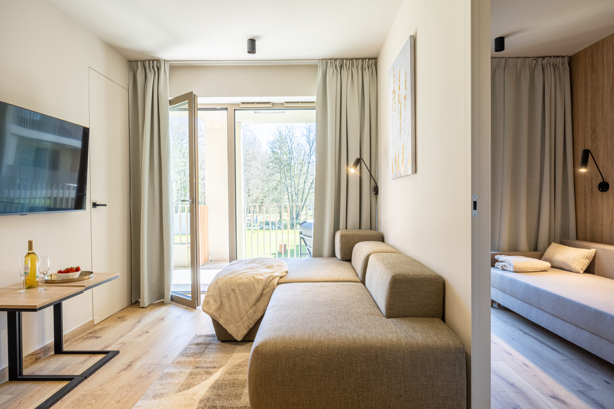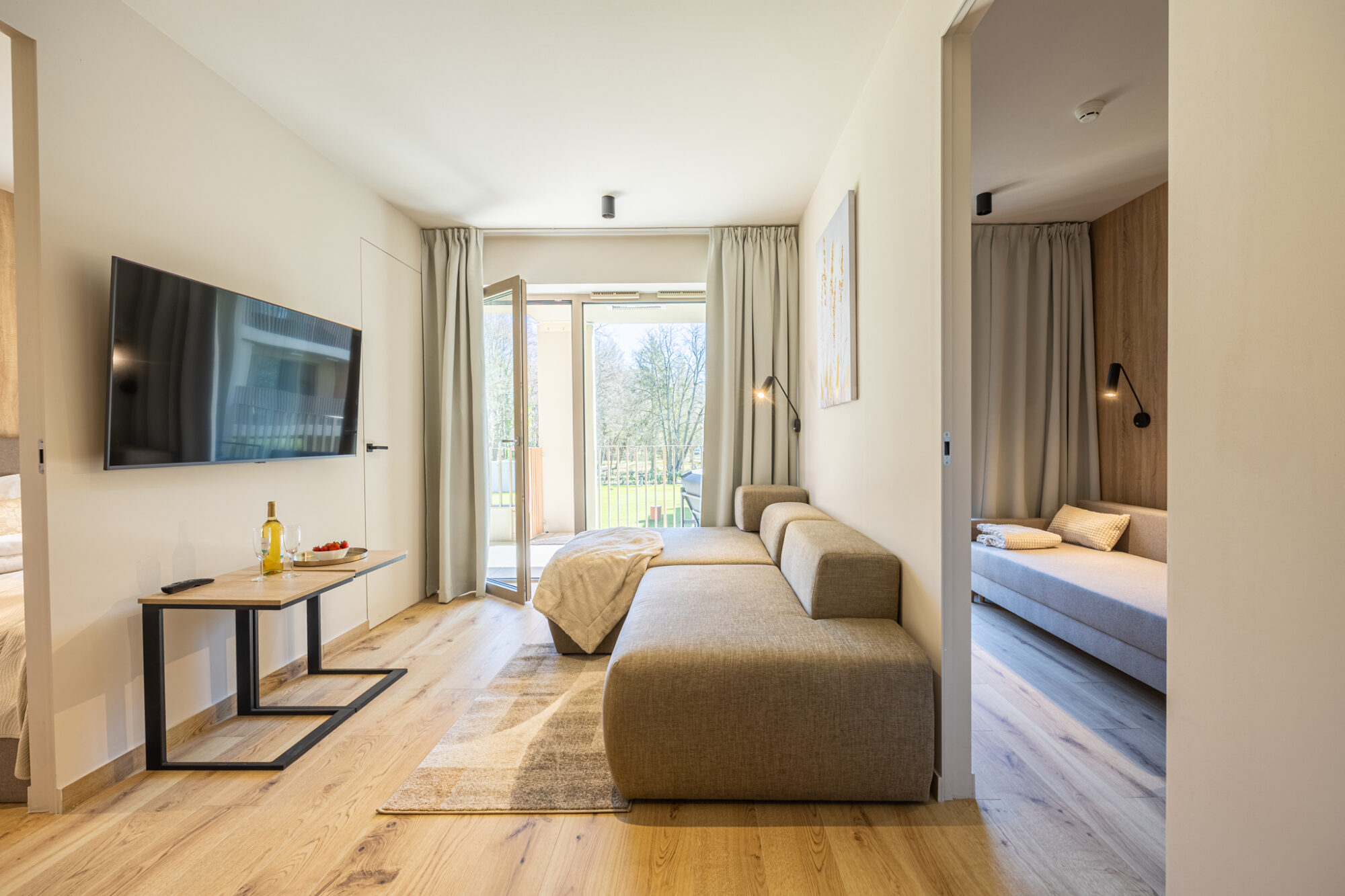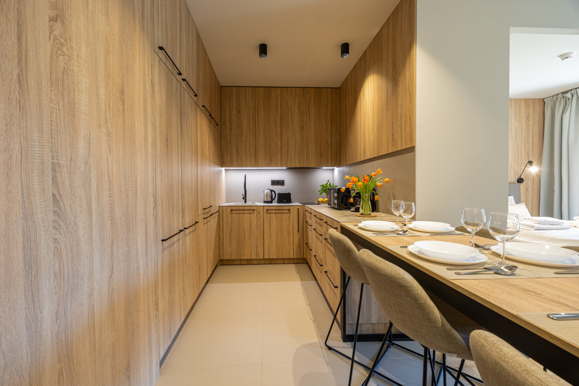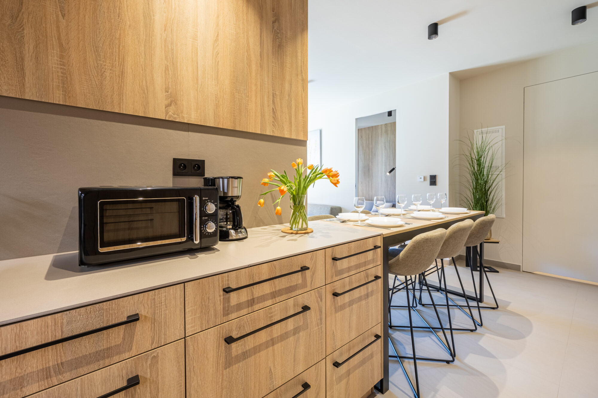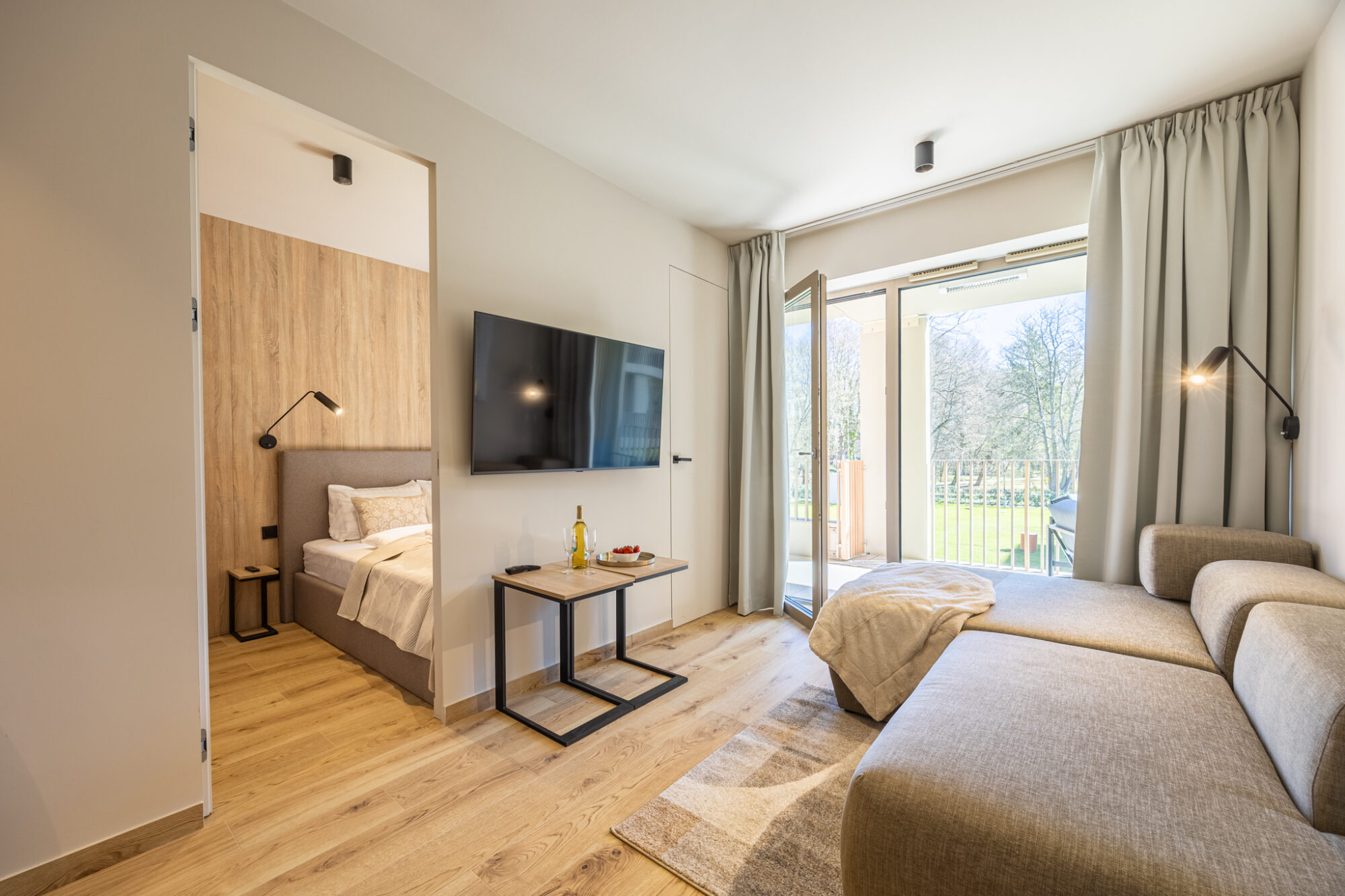 Komfortowy apartament, urządzony w nowoczesnym stylu, w pełni wyposażony zapewnia znakomite warunki do rodzinnego wypoczynku. Apartament składa się z salonu połączonego z kuchnią, która jest kompleksowo wyposażona (zmywarka do naczyń, lodówka, płyta elektryczna, czajnik elektryczny, toster, ekspres do kawy itp.), 2 sypialni (jedna z dużym łóżkiem, druga z sofą rozkładaną) i łazienki. Do apartamentu przynależy przestronny balkon.