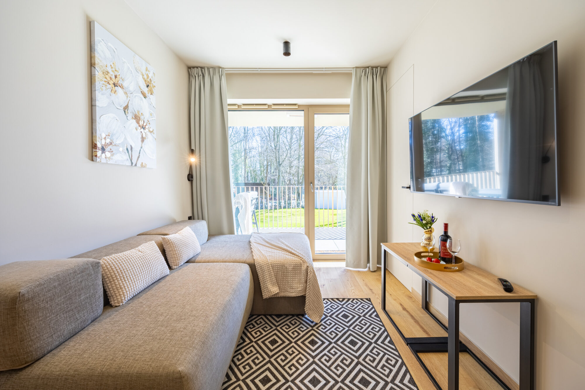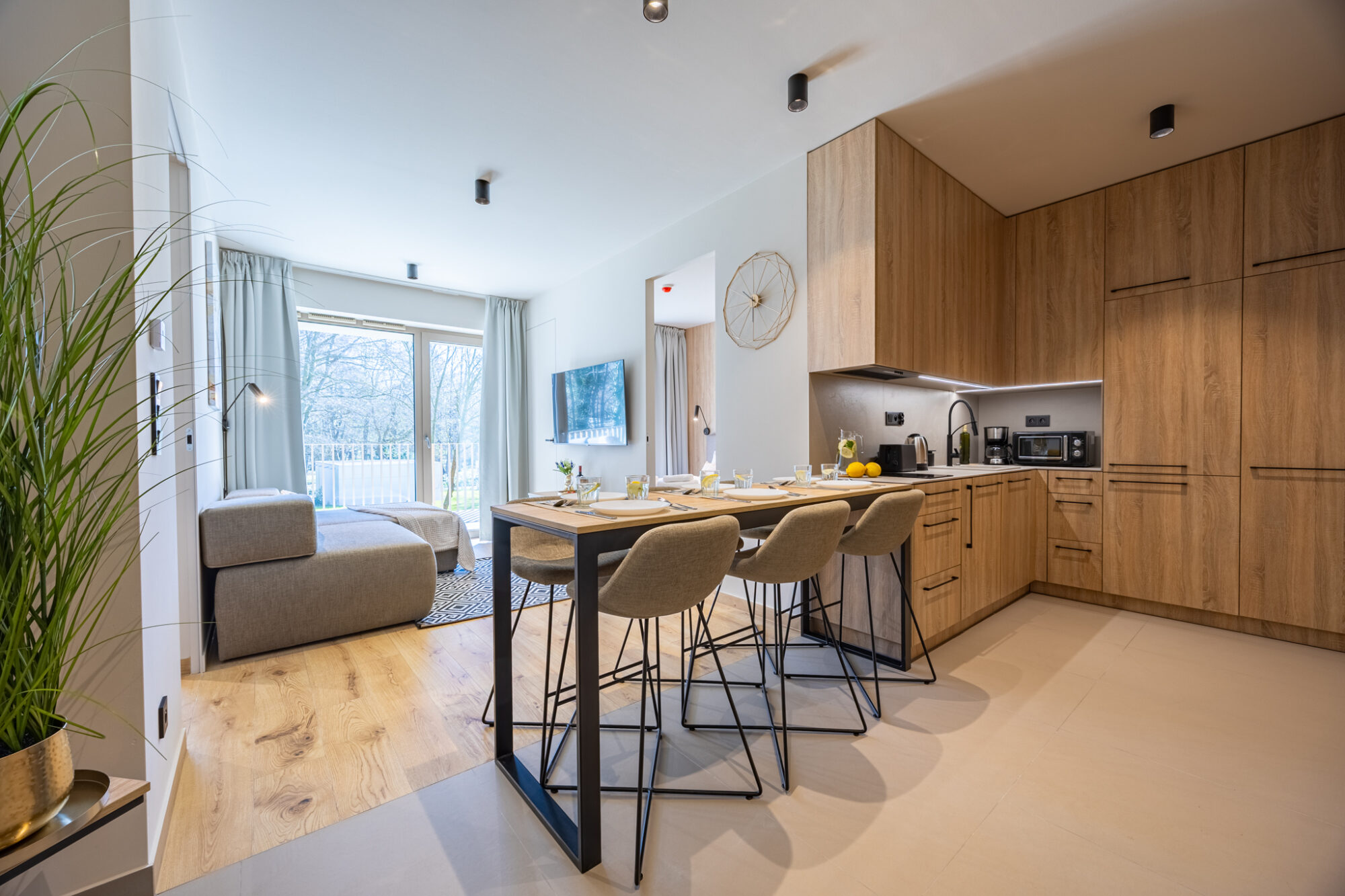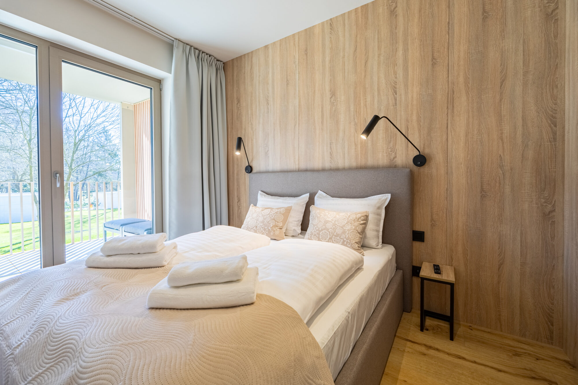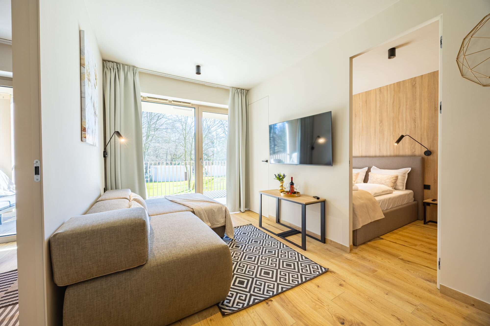 Komfortowy apartament, urządzony w nowoczesnym stylu, w pełni wyposażony zapewnia znakomite warunki do rodzinnego wypoczynku. Apartament składa się z salonu połączonego z kuchnią, która jest kompleksowo wyposażona (zmywarka do naczyń, lodówka, płyta elektryczna, czajnik elektryczny, toster, ekspres do kawy itp.), 2 sypialni (jedna z dużym łóżkiem, druga z sofą rozkładaną) i łazienki. Do apartamentu przynależy przestronny balkon.