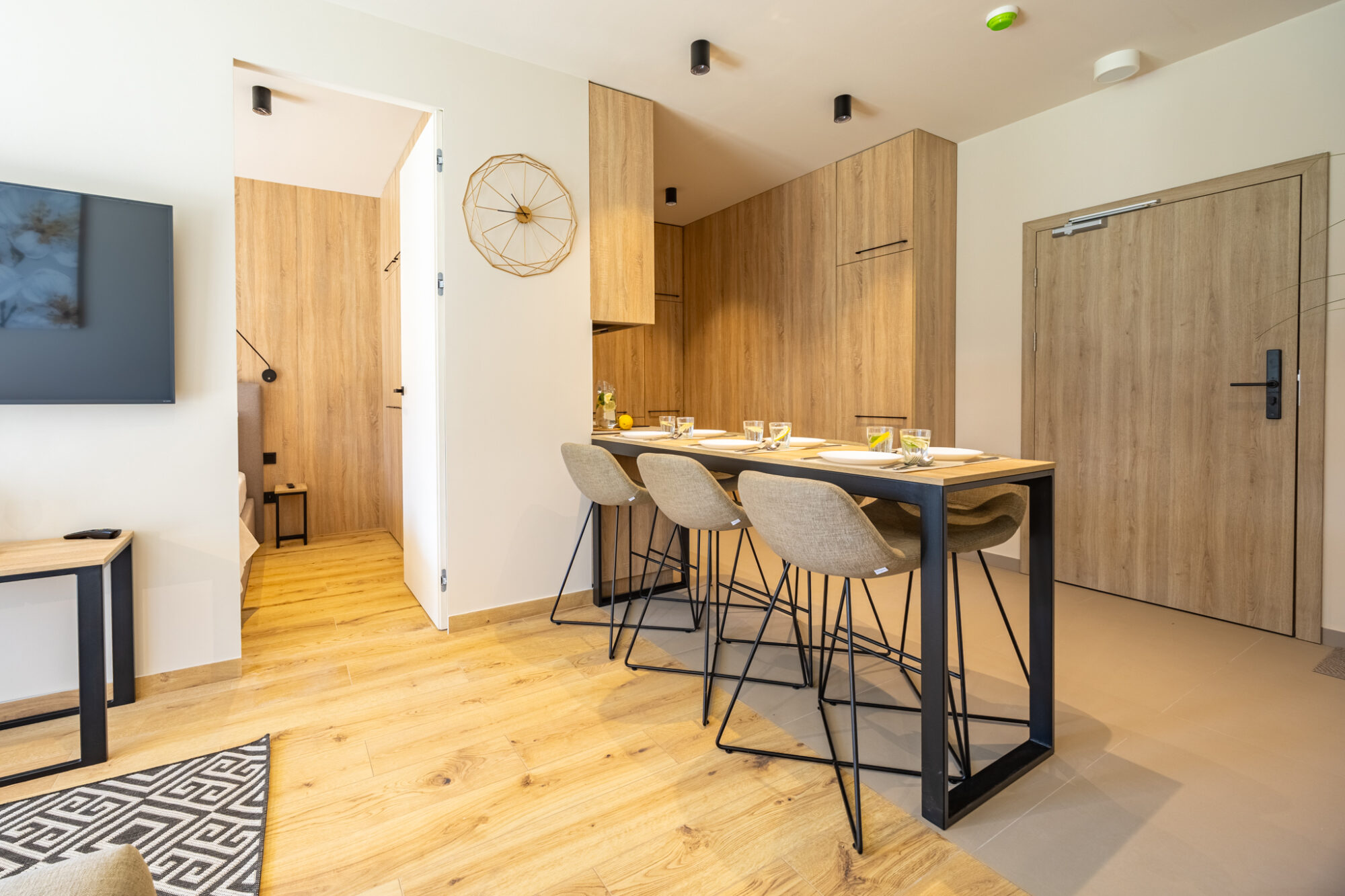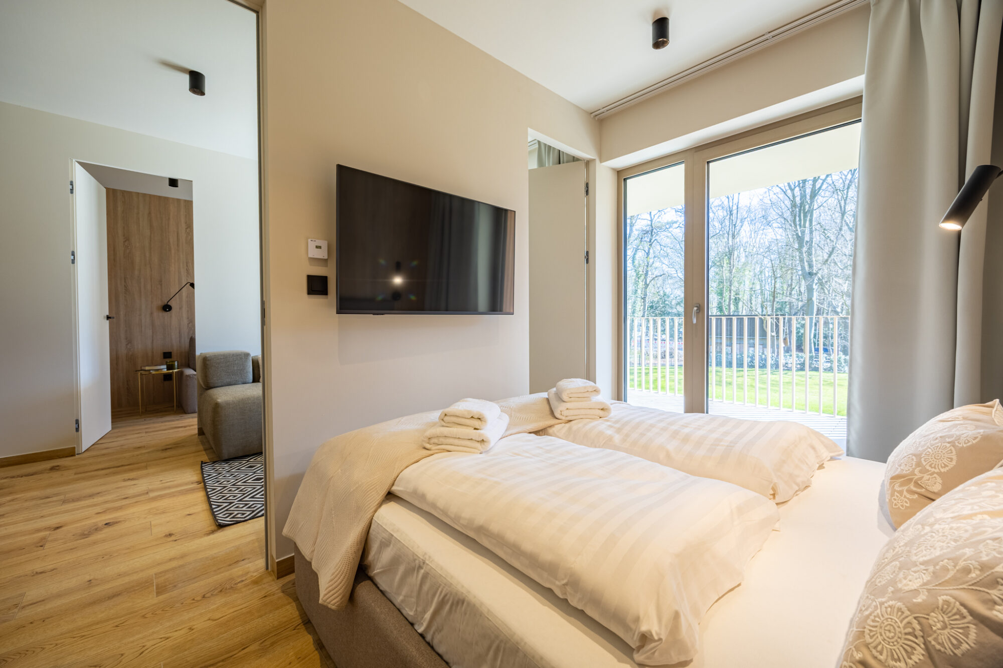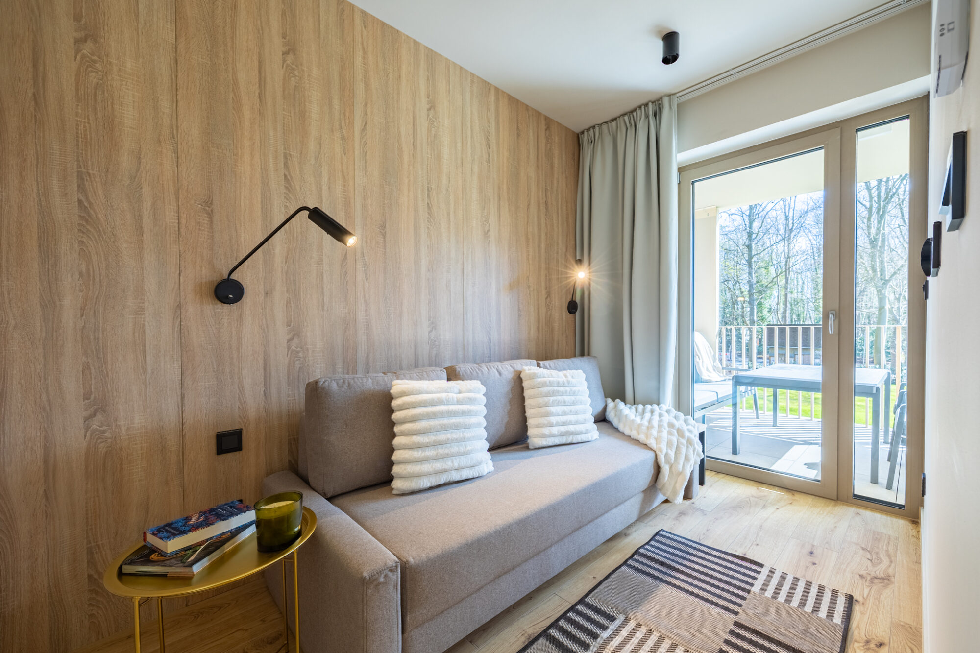Komfortowy apartament, urządzony w nowoczesnym stylu, w pełni wyposażony zapewnia znakomite warunki do rodzinnego wypoczynku. Apartament składa się z salonu połączonego z kuchnią, która jest kompleksowo wyposażona (zmywarka do naczyń, lodówka, płyta elektryczna, czajnik elektryczny, toster, ekspres do kawy itp.), 2 sypialni (jedna z dużym łóżkiem, druga z sofą rozkładaną) i łazienki. Do apartamentu przynależy przestronny balkon.