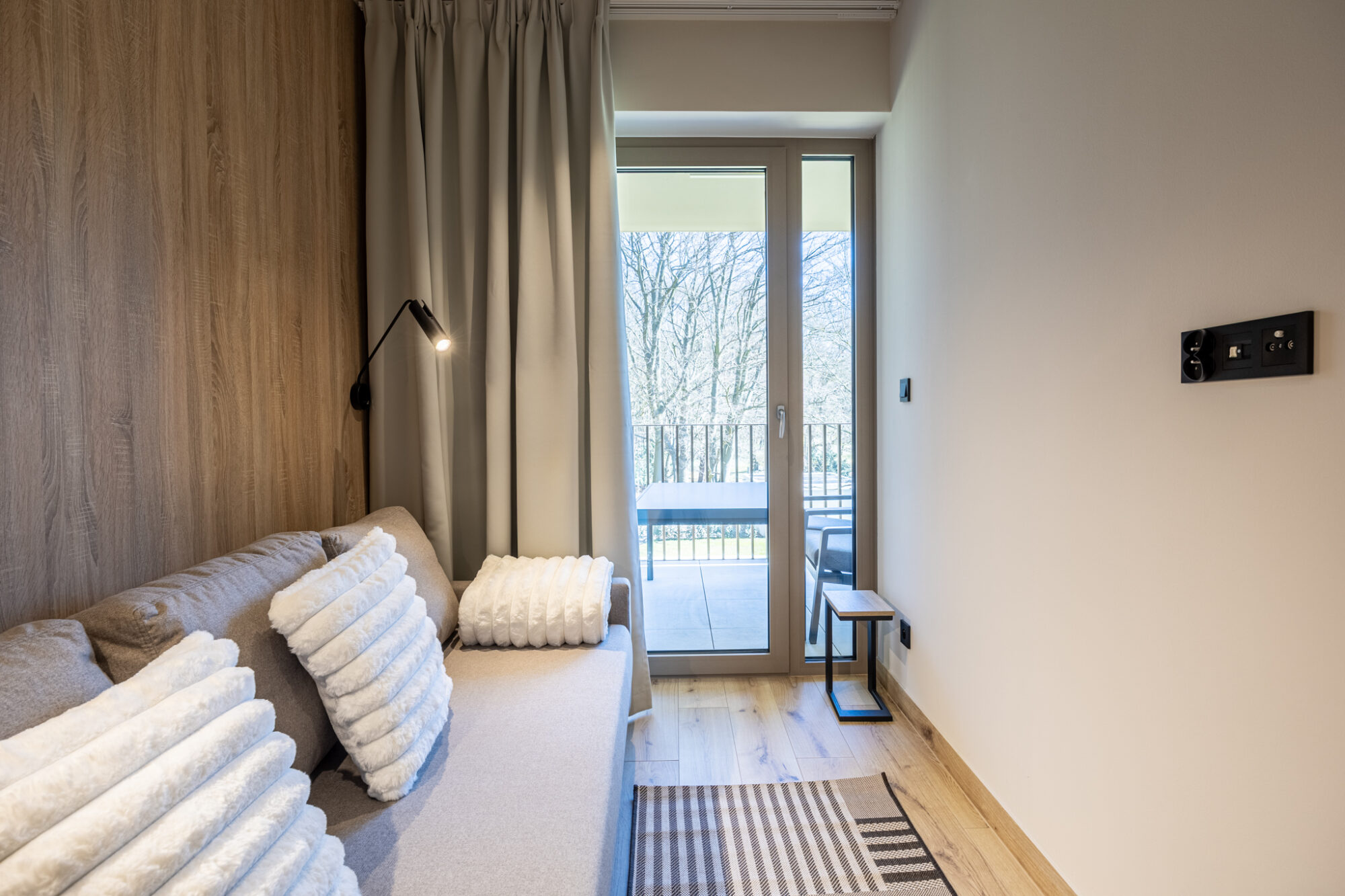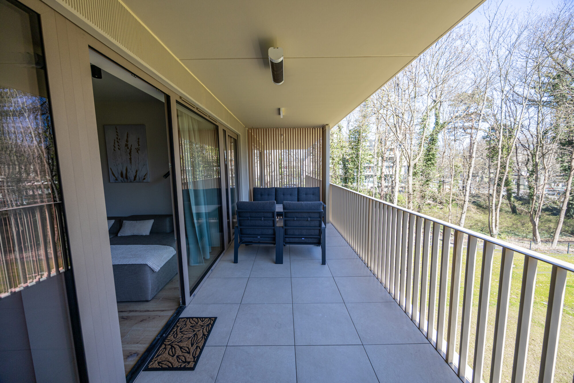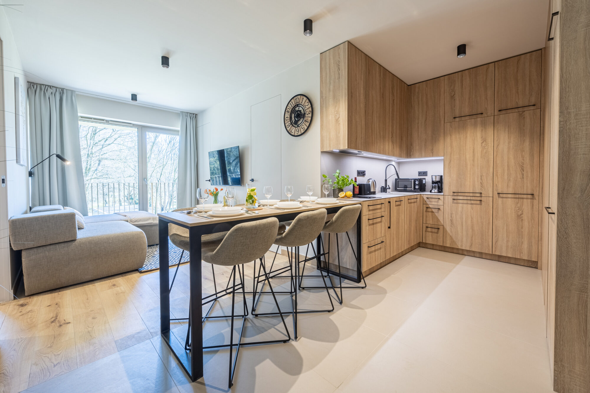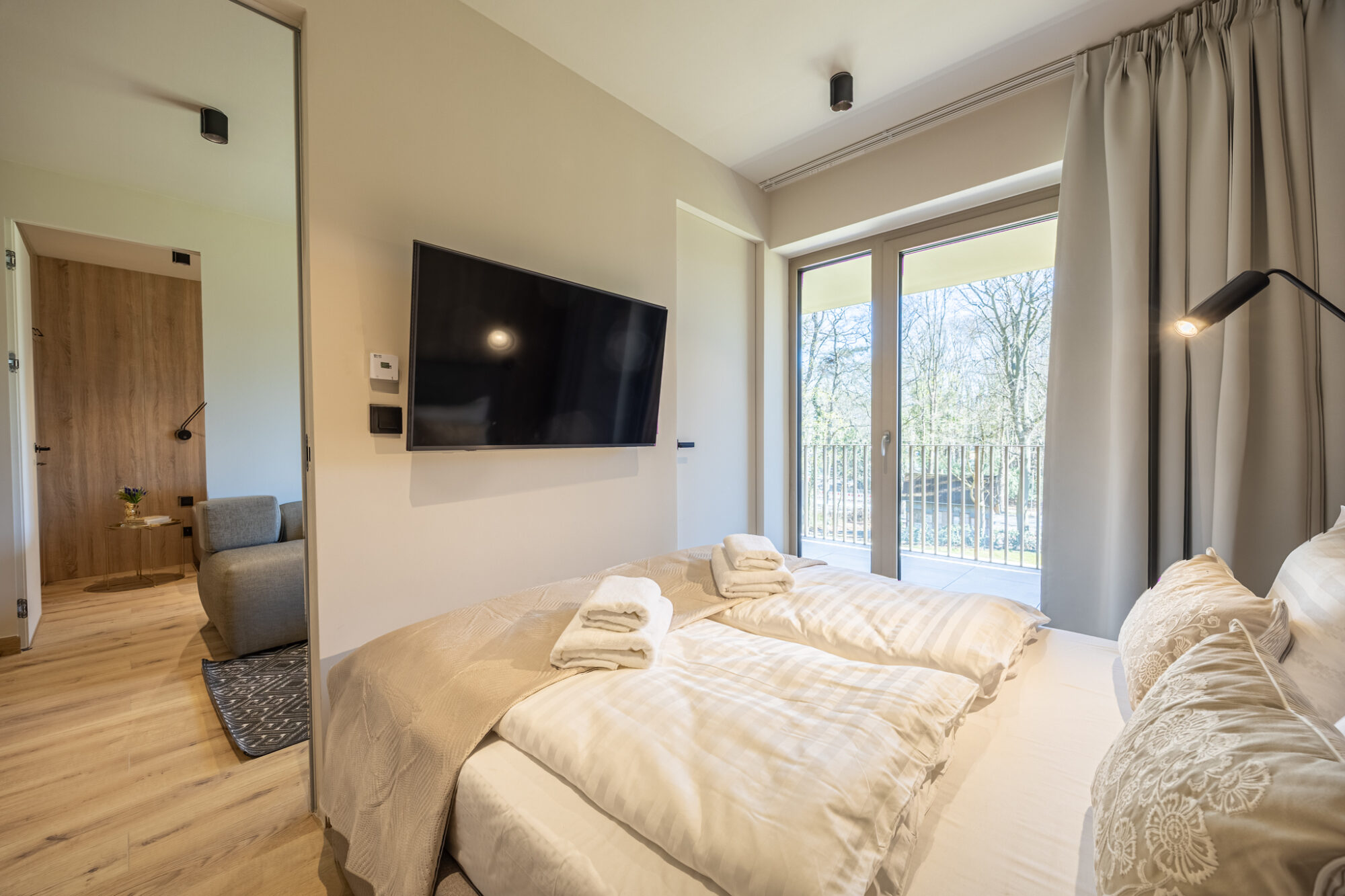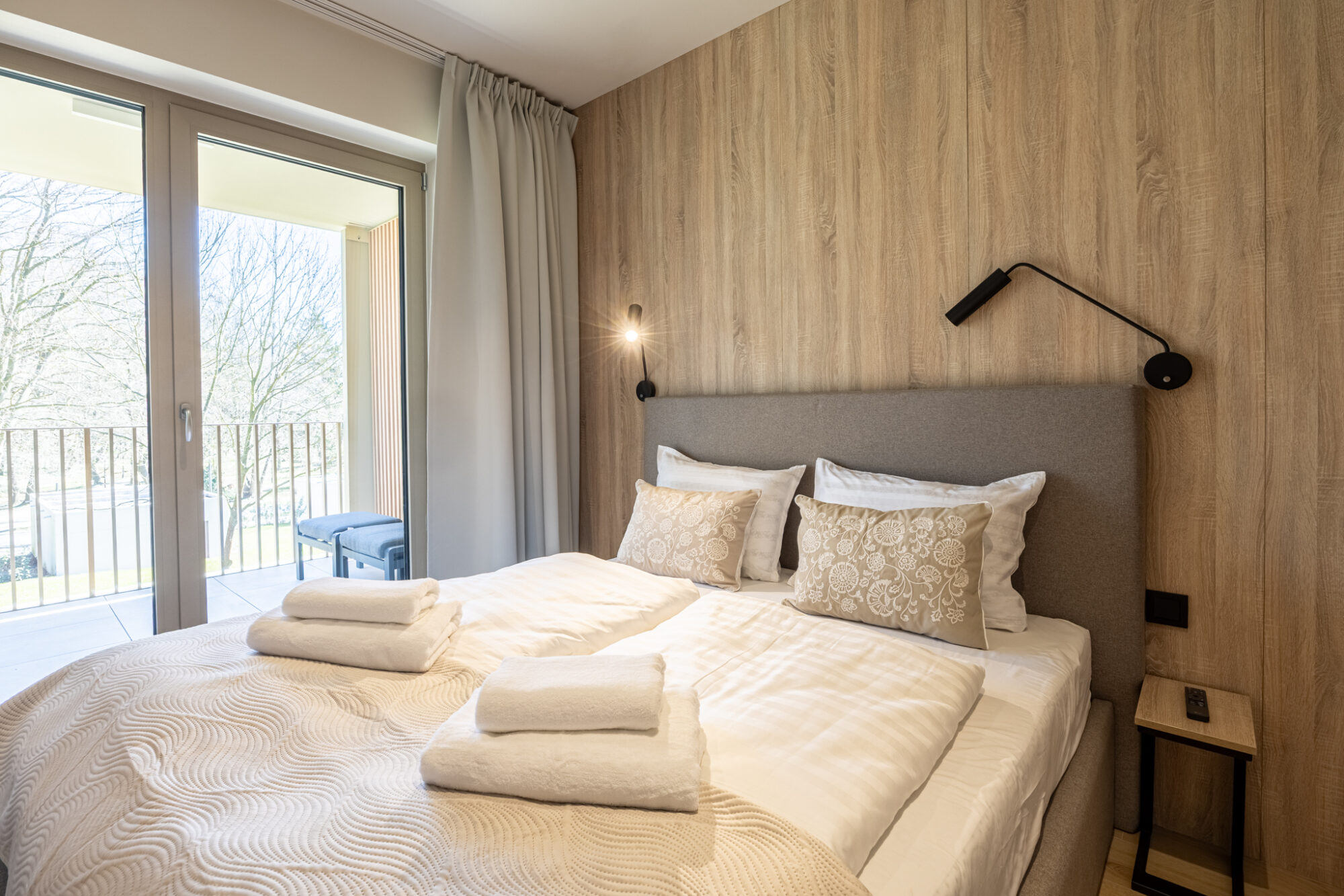 Komfortowy apartament, urządzony w nowoczesnym stylu, w pełni wyposażony zapewnia znakomite warunki do rodzinnego wypoczynku. Apartament składa się z salonu połączonego z kuchnią, która jest kompleksowo wyposażona (zmywarka do naczyń, lodówka, płyta elektryczna, czajnik elektryczny, toster, ekspres do kawy itp.), 2 sypialni (jedna z dużym łóżkiem, druga z sofą rozkładaną) i łazienki. Do apartamentu przynależy przestronny balkon.