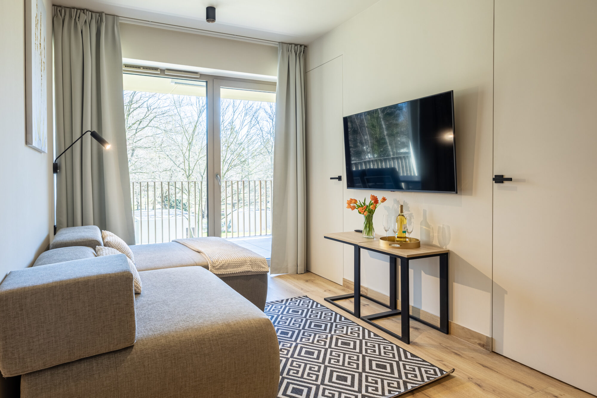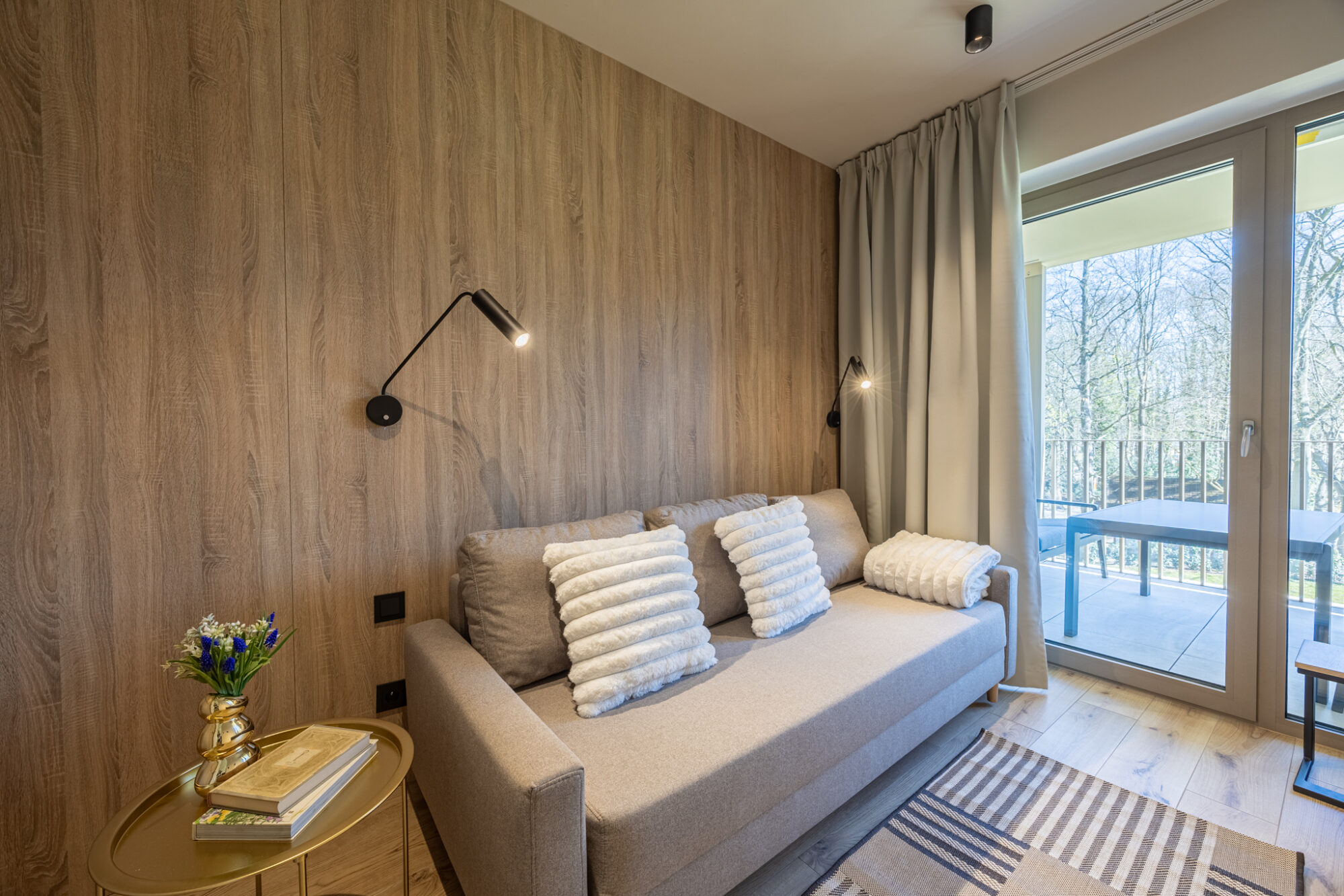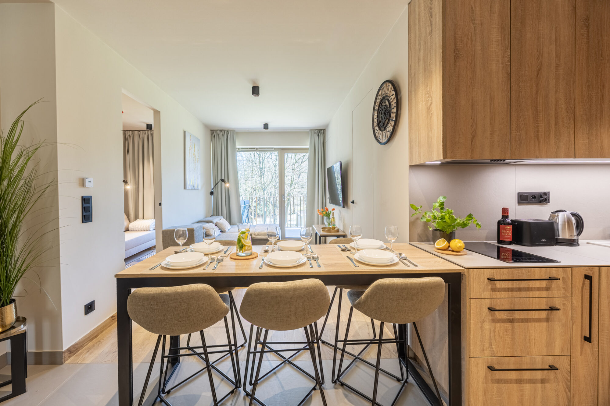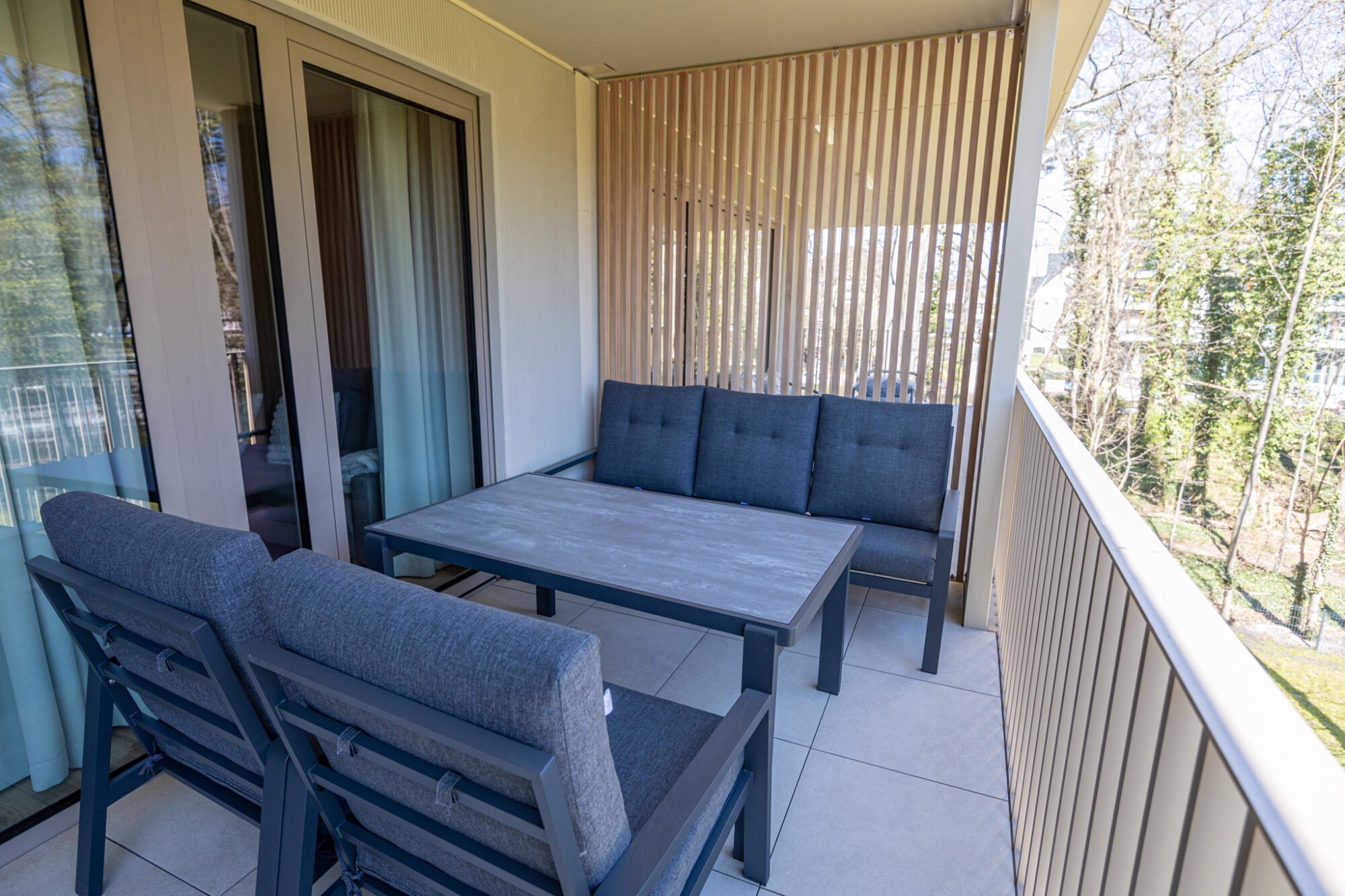 Komfortowy apartament, urządzony w nowoczesnym stylu, w pełni wyposażony zapewnia znakomite warunki do rodzinnego wypoczynku. Apartament składa się z salonu połączonego z kuchnią, która jest kompleksowo wyposażona (zmywarka do naczyń, lodówka, płyta elektryczna, czajnik elektryczny, toster, ekspres do kawy itp.), 2 sypialni (jedna z dużym łóżkiem, druga z sofą rozkładaną) i łazienki. Do apartamentu przynależy przestronny balkon.