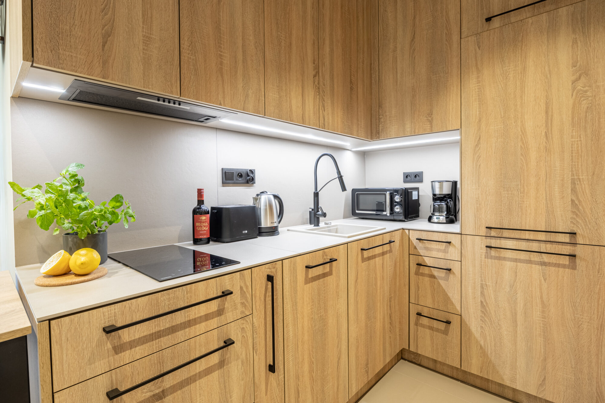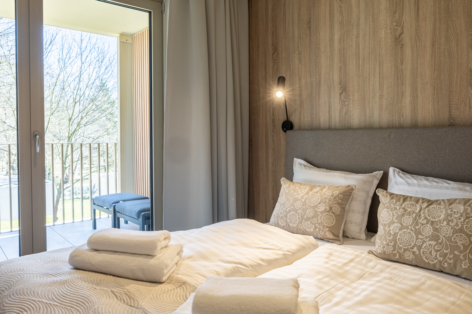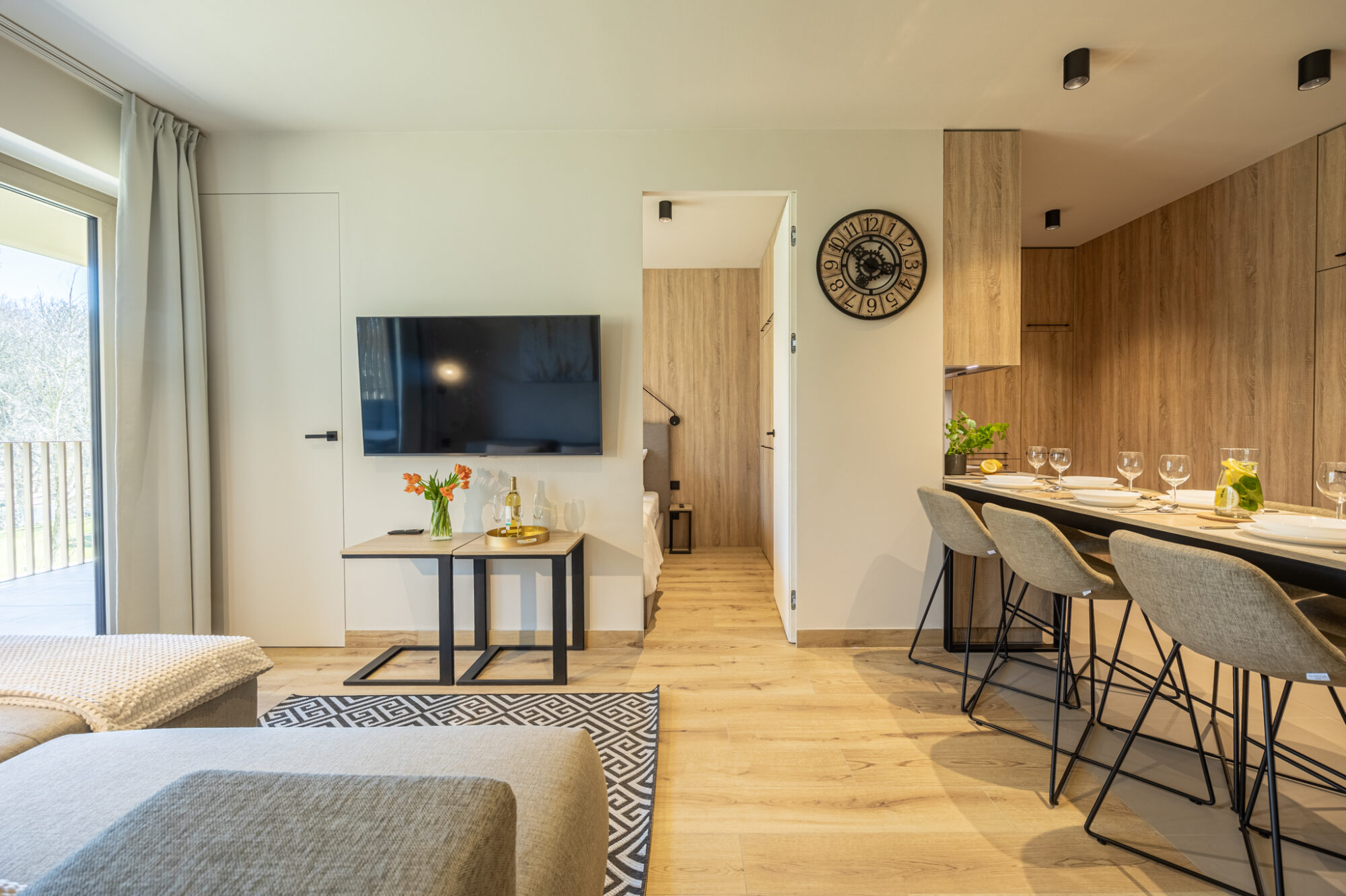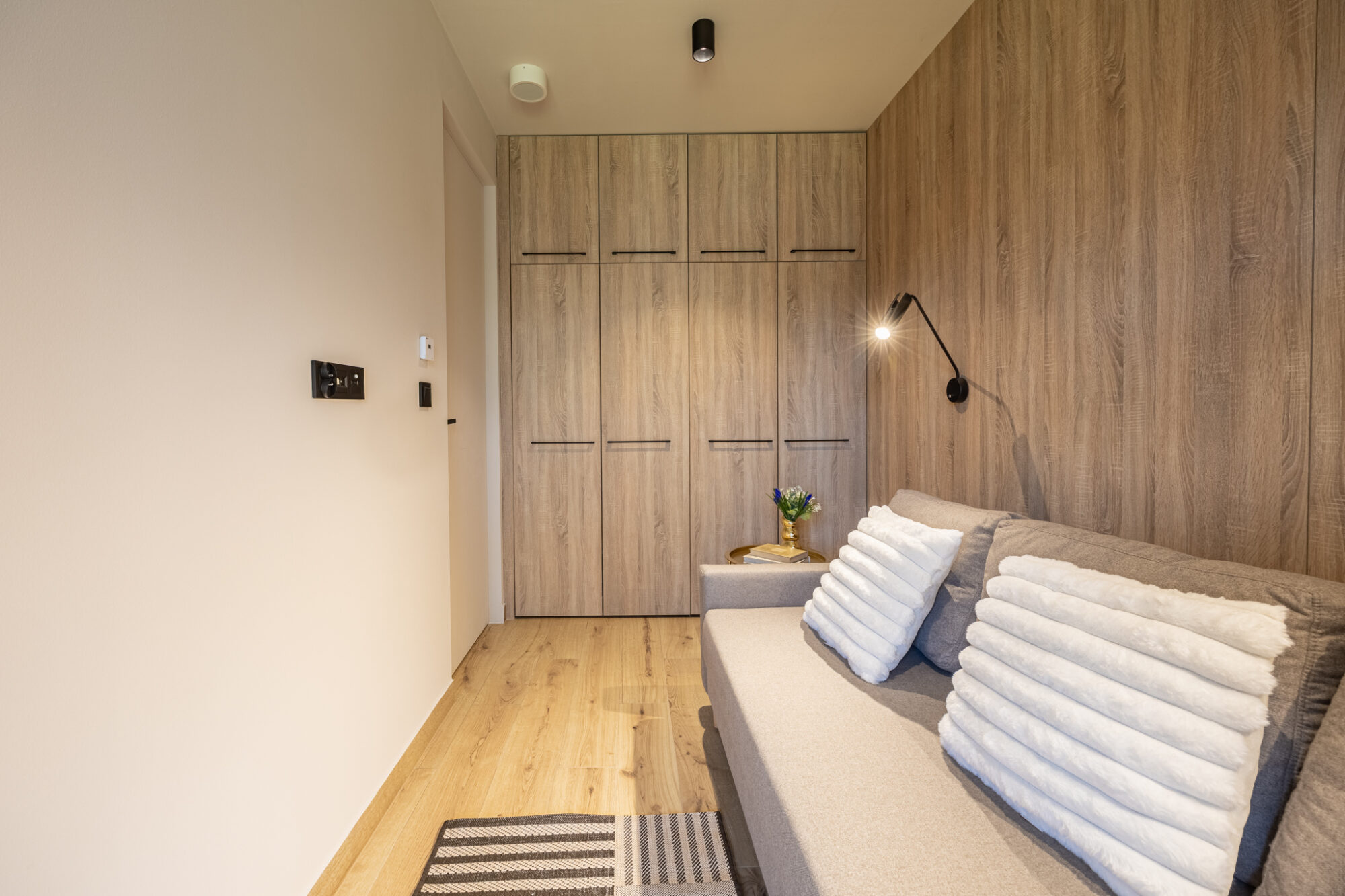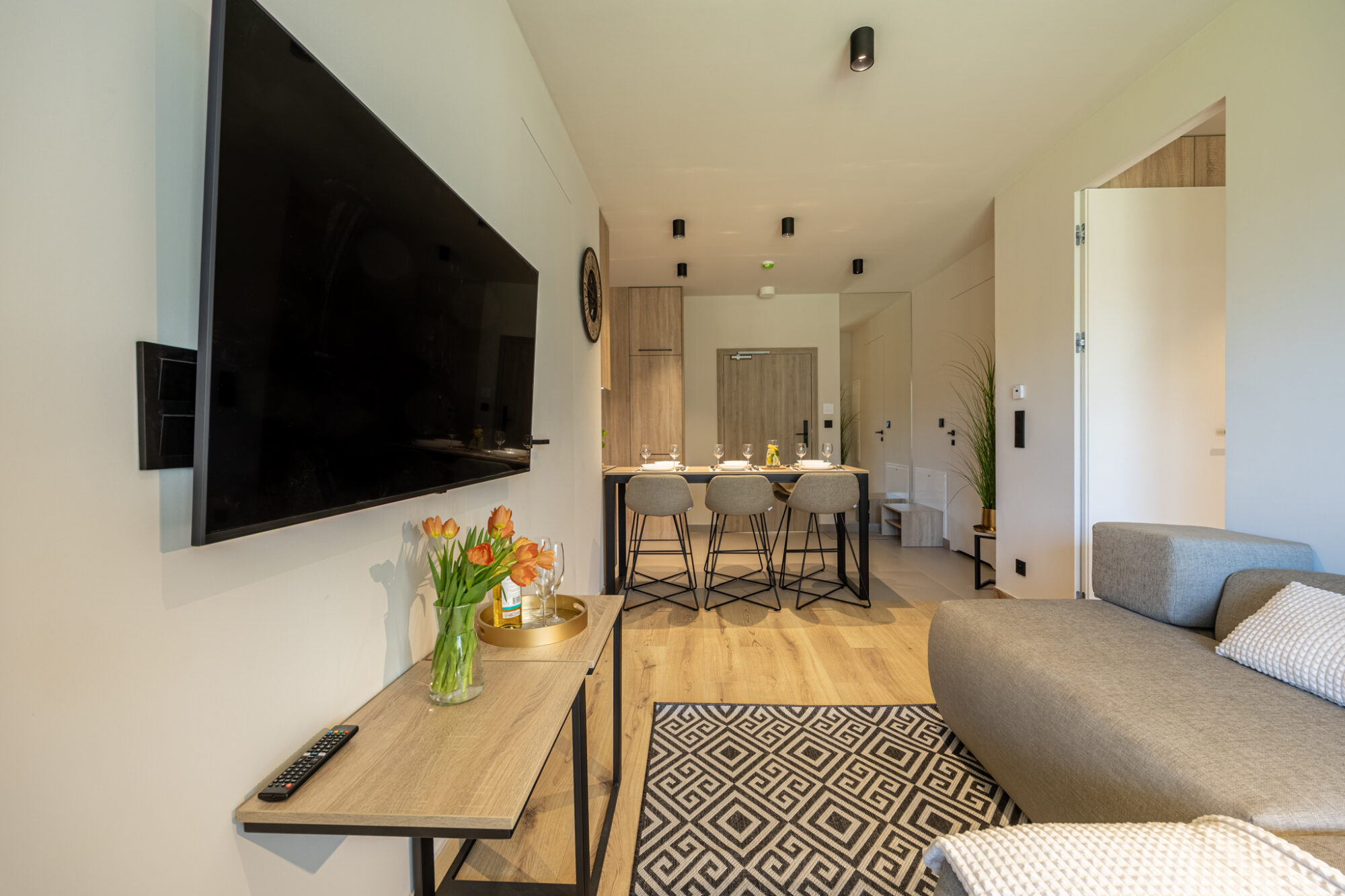 Komfortowy apartament, urządzony w nowoczesnym stylu, w pełni wyposażony zapewnia znakomite warunki do rodzinnego wypoczynku. Apartament składa się z salonu połączonego z kuchnią, która jest kompleksowo wyposażona (zmywarka do naczyń, lodówka, płyta elektryczna, czajnik elektryczny, toster, ekspres do kawy itp.), 2 sypialni (jedna z dużym łóżkiem, druga z sofą rozkładaną) i łazienki. Do apartamentu przynależy przestronny balkon.