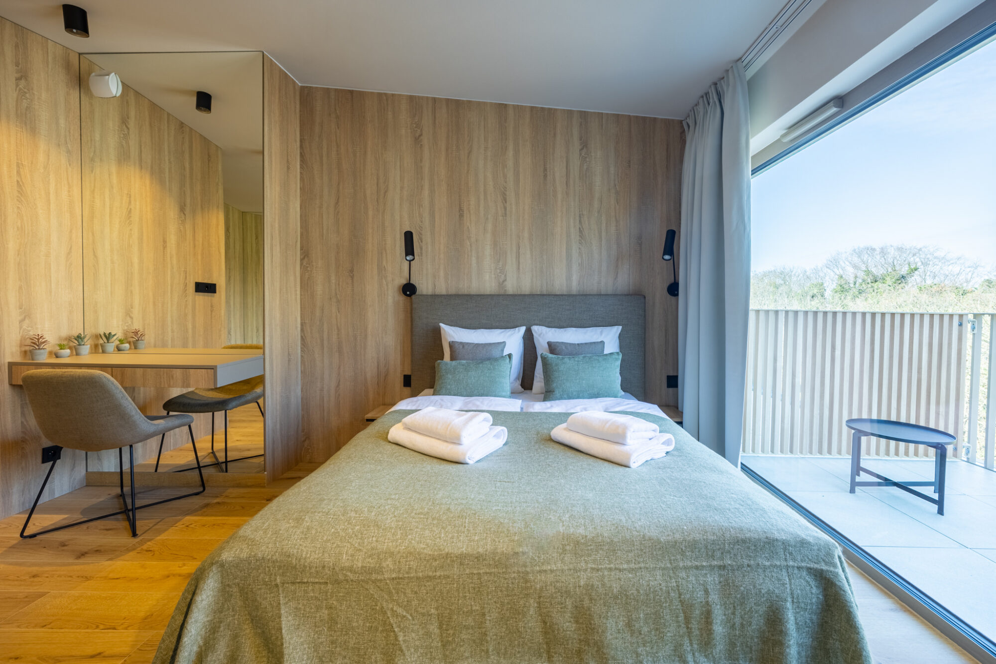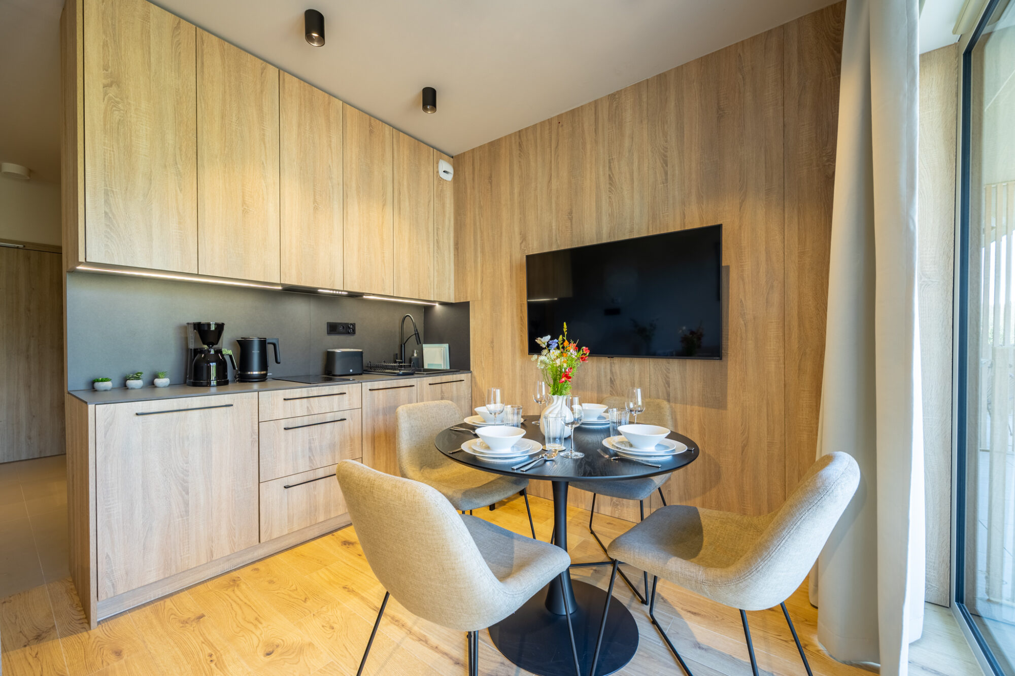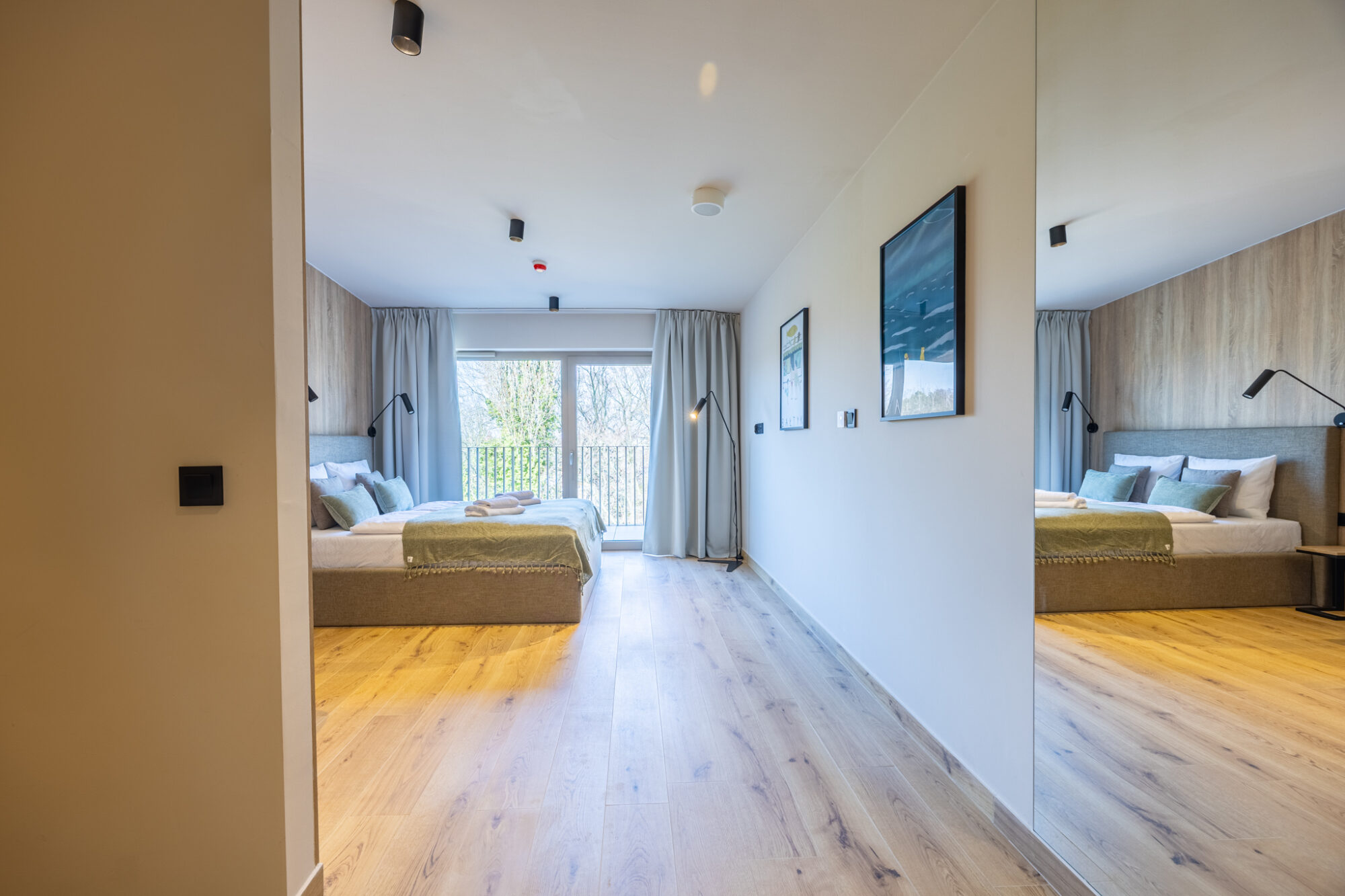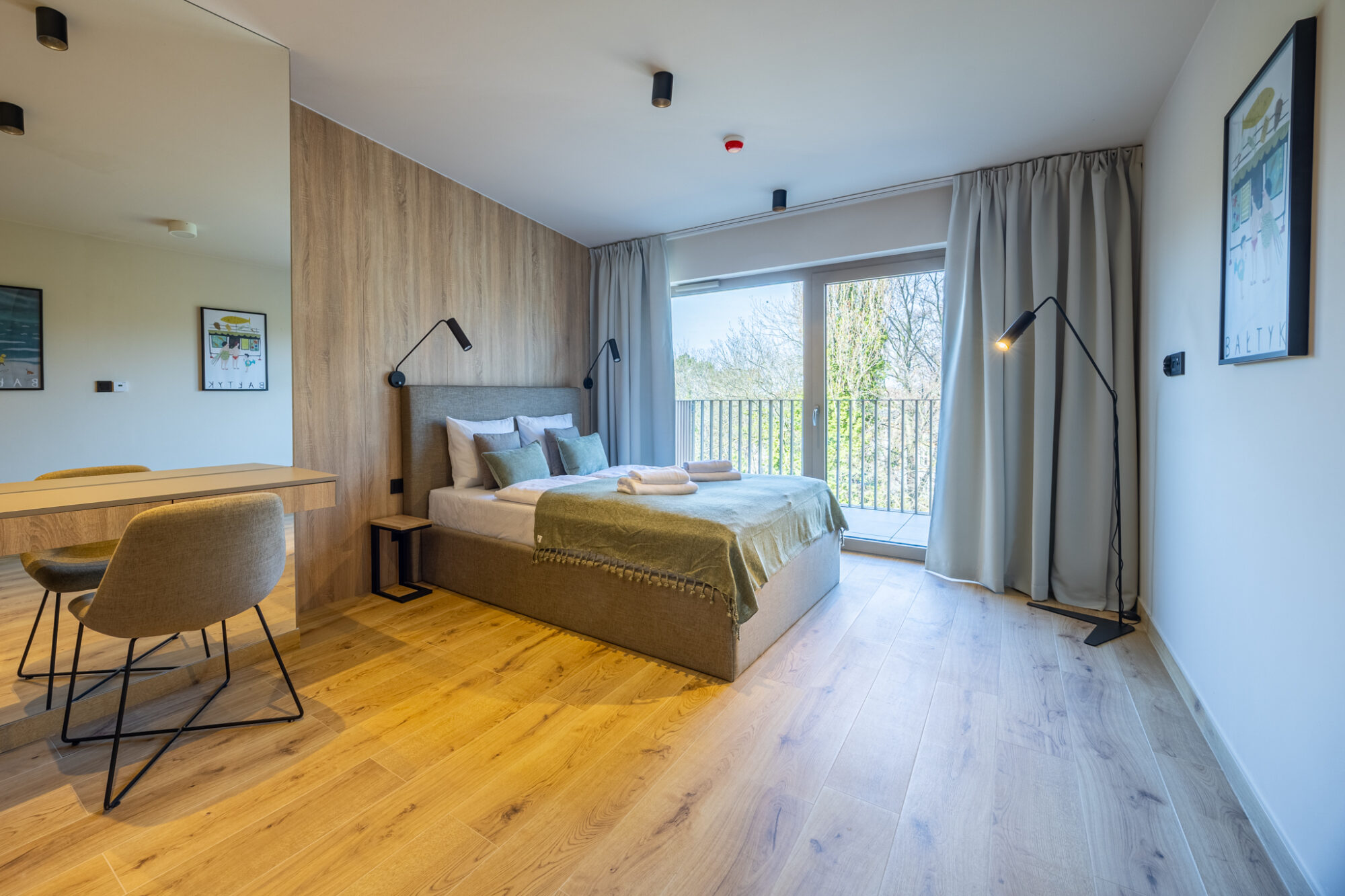 Komfortowy apartament, urządzony w nowoczesnym stylu, w pełni wyposażony zapewnia znakomite warunki do rodzinnego wypoczynku. Apartament składa się z pokoju dziennego z aneksem kuchennym, która jest kompleksowo wyposażona (zmywarka do naczyń, lodówka, piekarnik, płyta elektryczna, czajnik elektryczny, toster, ekspres do kawy itp.), przestronnej sypialni na drugim poziomie i łazienki. Do apartamentu przynależą 2 duże balkony (na pierwszym i drugim poziomie), idealne do wypoczynku i relaksu.