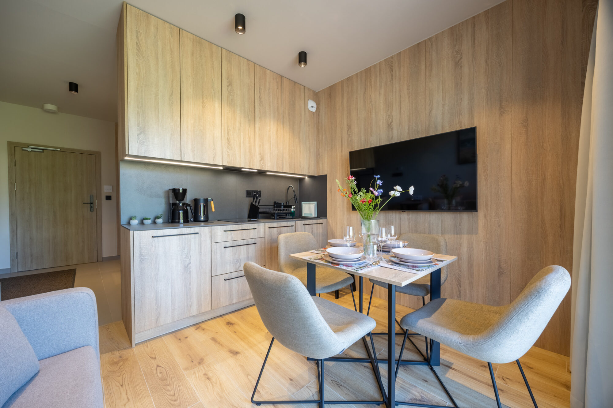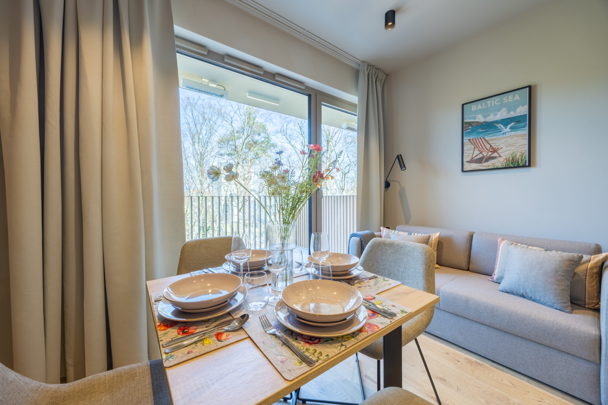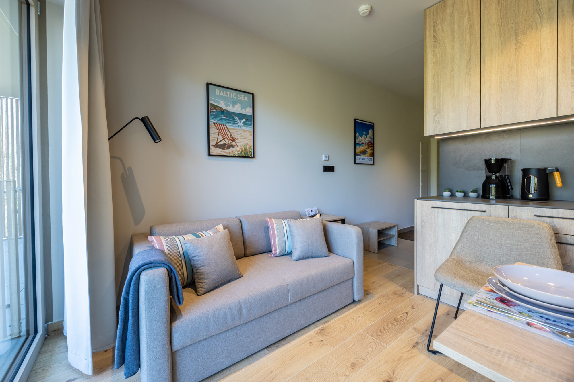 Komfortowy apartament, urządzony w nowoczesnym stylu, w pełni wyposażony zapewnia znakomite warunki do rodzinnego wypoczynku. Apartament składa się z pokoju dziennego z aneksem kuchennym, która jest kompleksowo wyposażona (zmywarka do naczyń, lodówka, piekarnik, płyta elektryczna, czajnik elektryczny, toster, ekspres do kawy itp.), przestronnej sypialni na drugim poziomie i łazienki. Do apartamentu przynależą 2 duże balkony (na pierwszym i drugim poziomie), idealne do wypoczynku i relaksu.