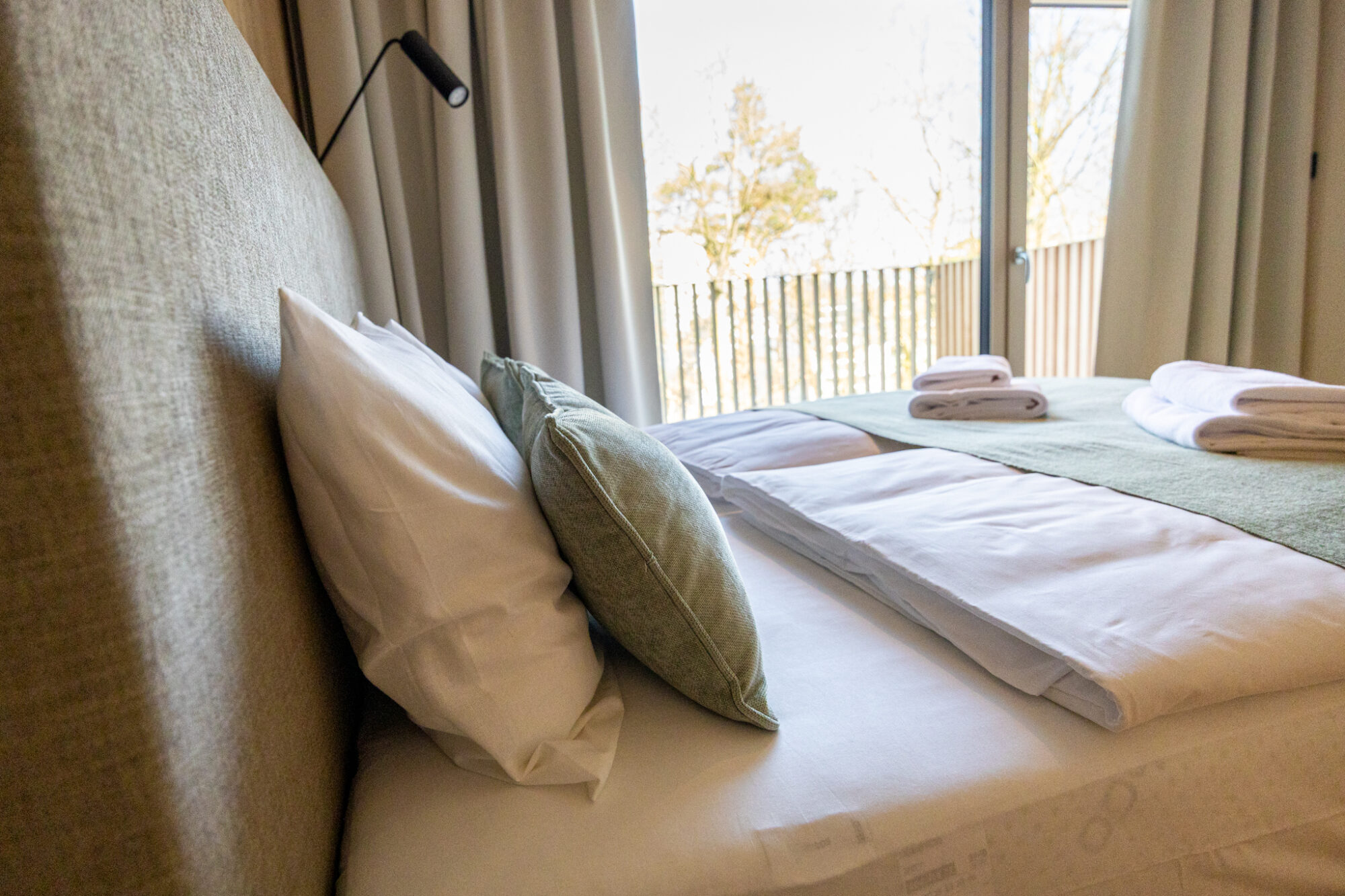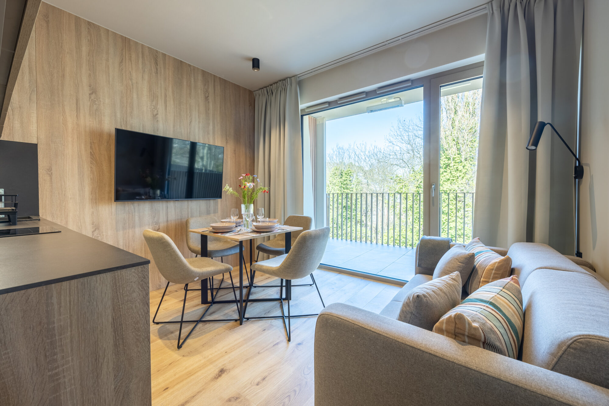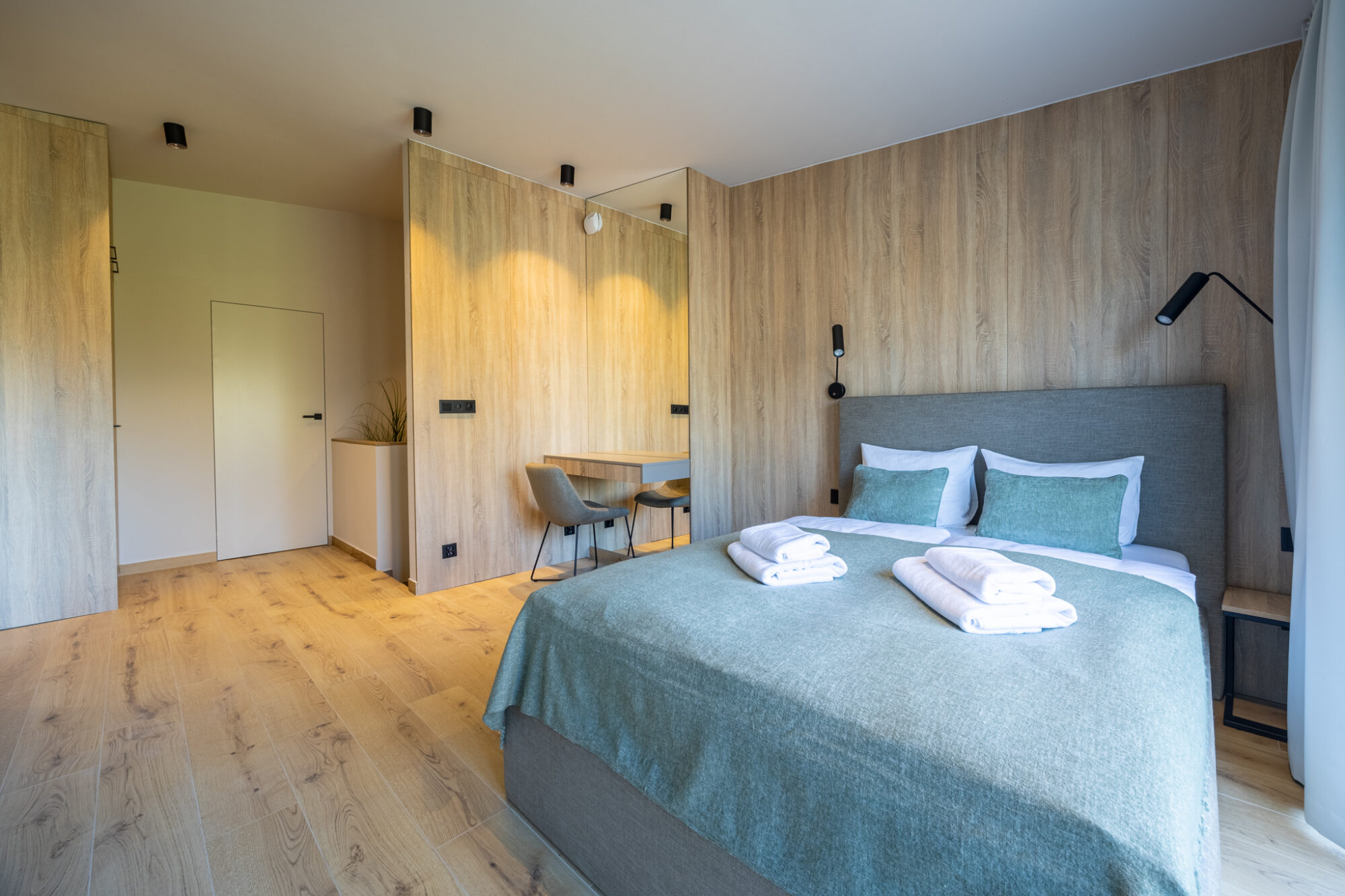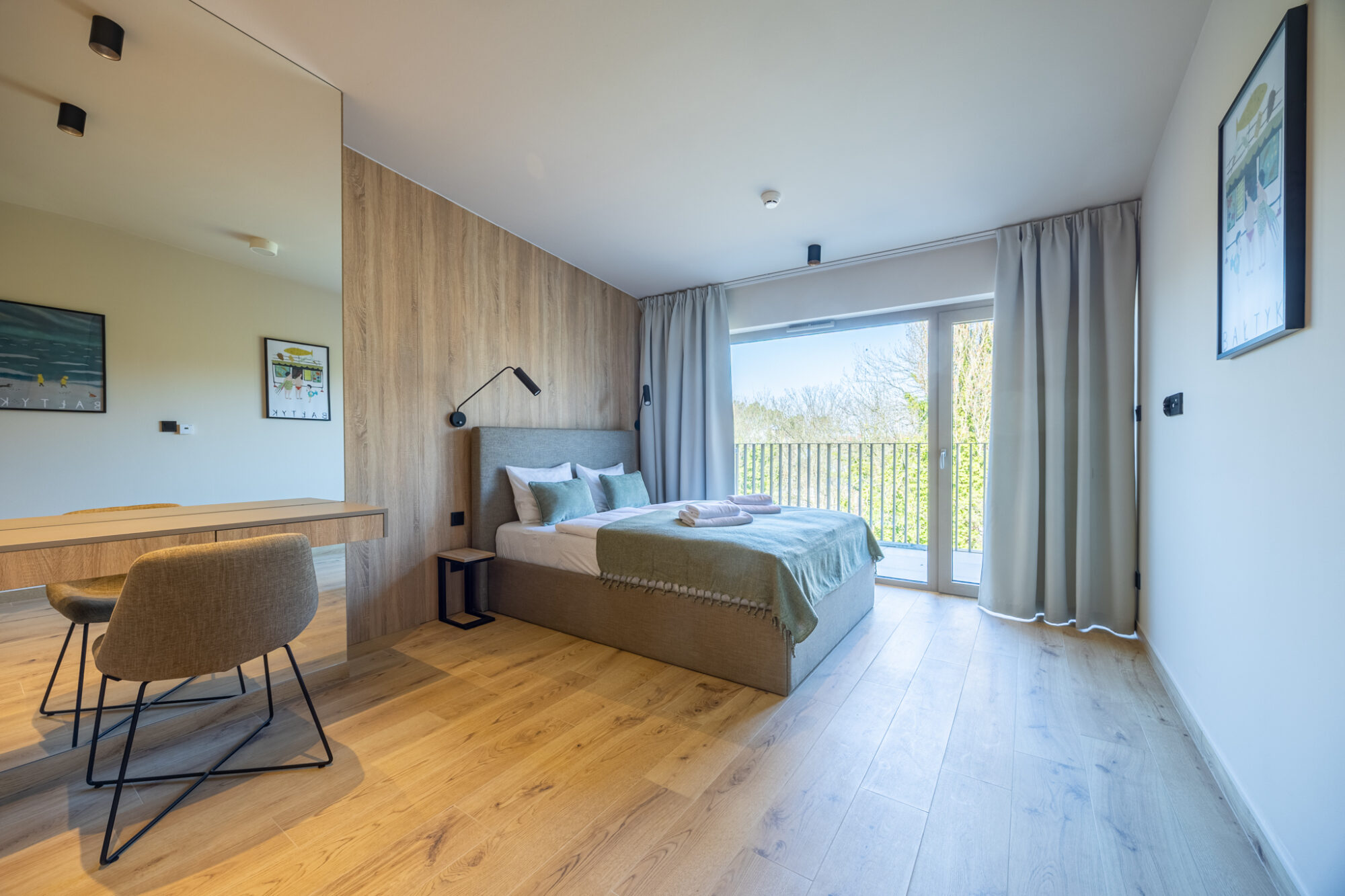 Komfortowy apartament, urządzony w nowoczesnym stylu, w pełni wyposażony zapewnia znakomite warunki do rodzinnego wypoczynku. Apartament składa się z pokoju dziennego z aneksem kuchennym, która jest kompleksowo wyposażona (zmywarka do naczyń, lodówka, piekarnik, płyta elektryczna, czajnik elektryczny, toster, ekspres do kawy itp.), przestronnej sypialni na drugim poziomie i łazienki. Do apartamentu przynależą 2 duże balkony (na pierwszym i drugim poziomie), idealne do wypoczynku i relaksu.