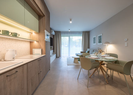 Der Greeneri-Komplex liegt im Kurort Swinemünde, umgeben von viel Grün, 500 Meter vom Strand entfernt und direkt neben dem Kurpark.