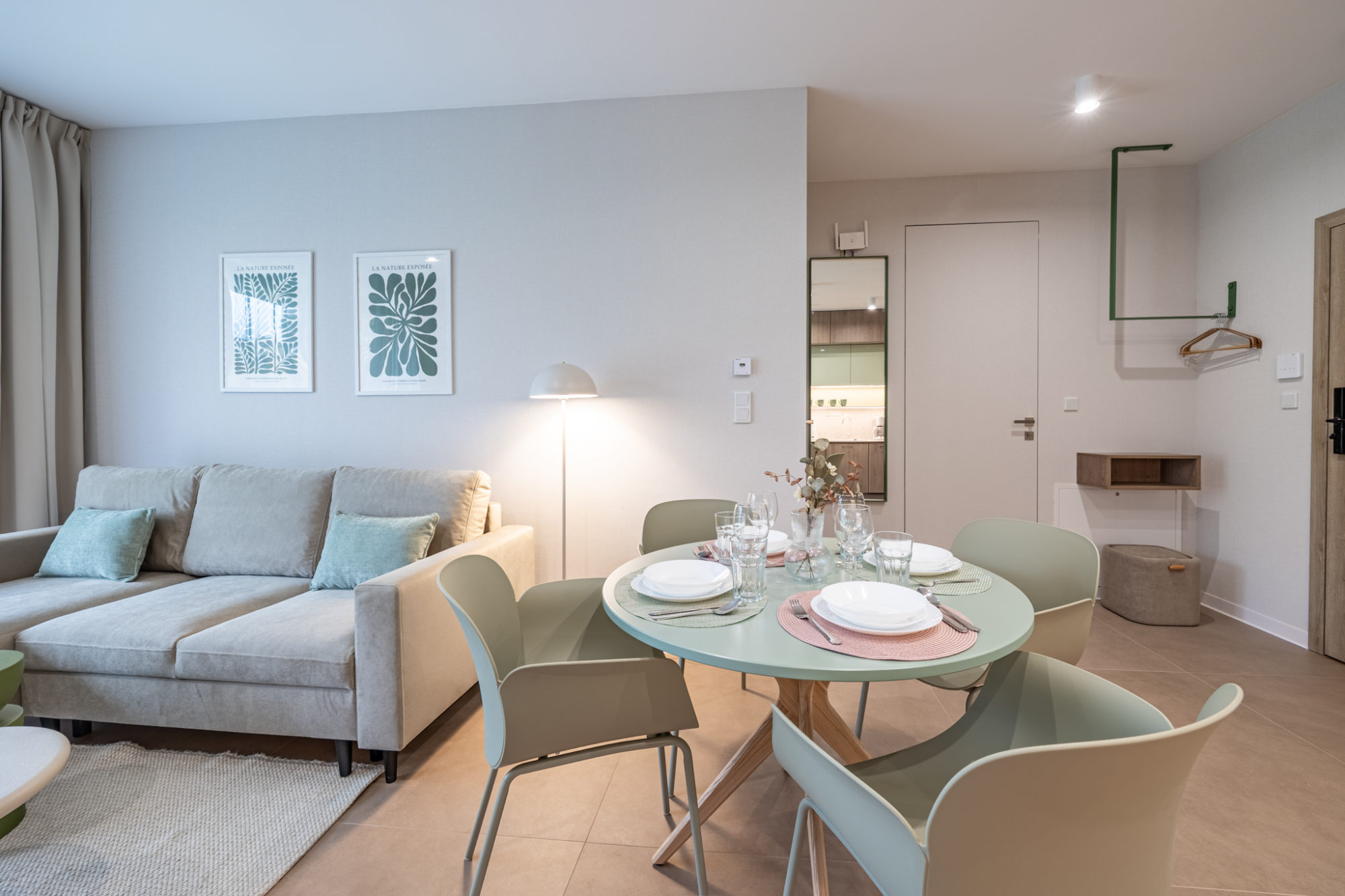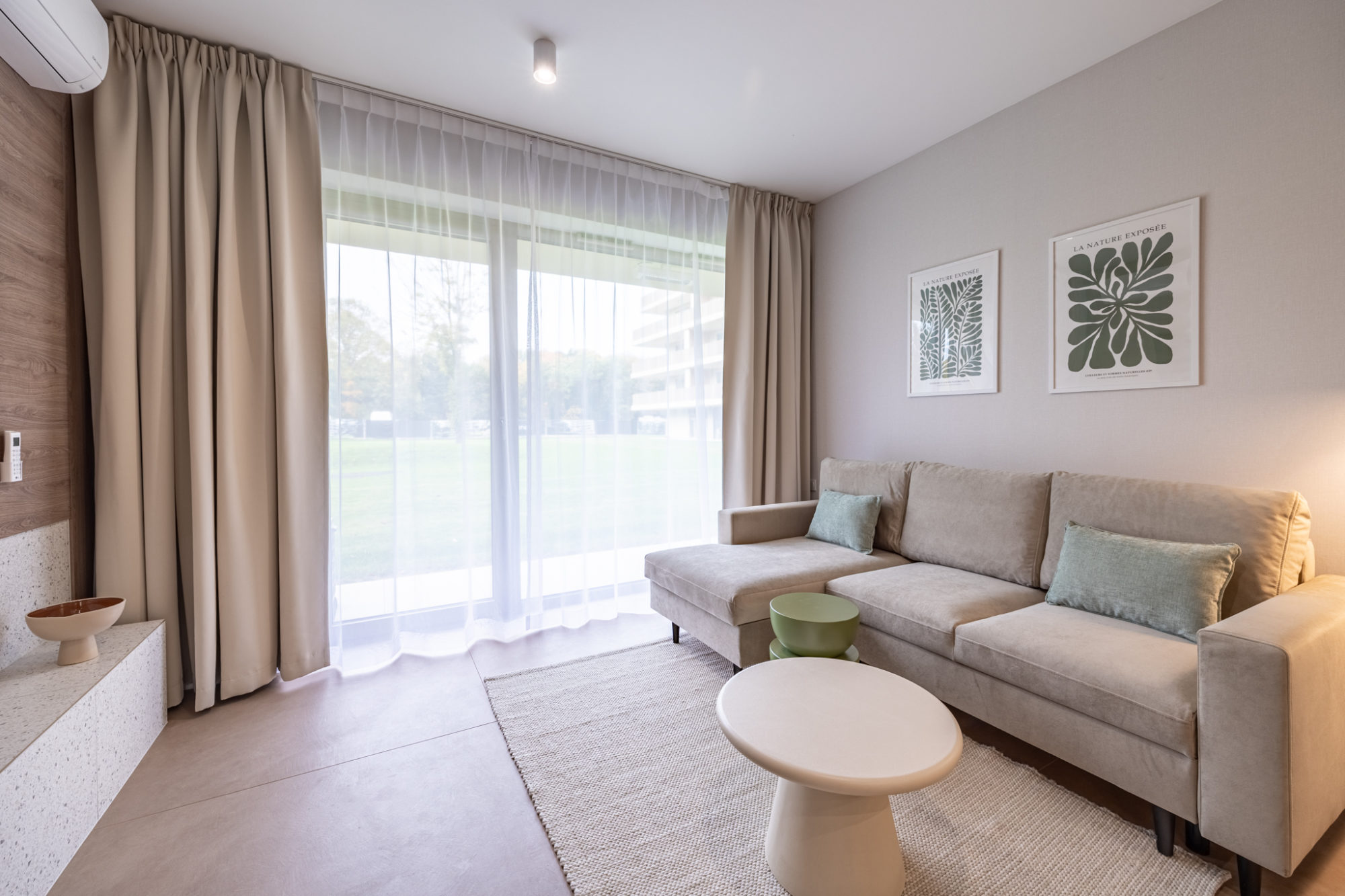 Dieses Zweizimmer-Apartment befindet sich im Erdgeschoss und besteht aus einem Wohnzimmer mit voll ausgestatteter Küchenzeile (Kühlschrank, Elektroherd mit zwei Kochplatten, Geschirrspüler, Kaffeemaschine und Wasserkocher), einem Schlafzimmer (Doppelbett) und einem Badezimmer mit Dusche. Ein großer Vorteil dieses Apartments ist die geräumige Terrasse mit herrlichem Blick ins Grüne. Zur weiteren Ausstattung gehören ein Flachbildfernseher, ein Bügeleisen/-brett, ein Haartrockner und ein Wäschetrockner. WLAN ist im gesamten Apartment verfügbar.