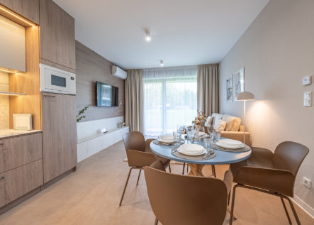 Diese gemütliche Zweizimmerwohnung befindet sich im Erdgeschoss eines Gebäudes im neuen Greeneri Park-Komplex, der wunderschön in Swinemünde, direkt neben dem Kurpark, liegt.