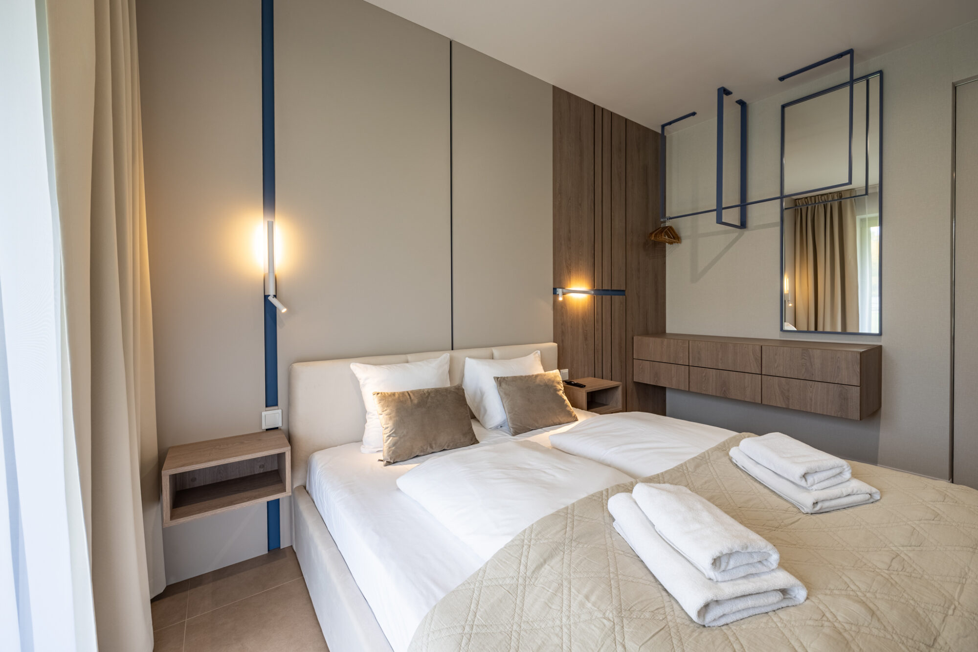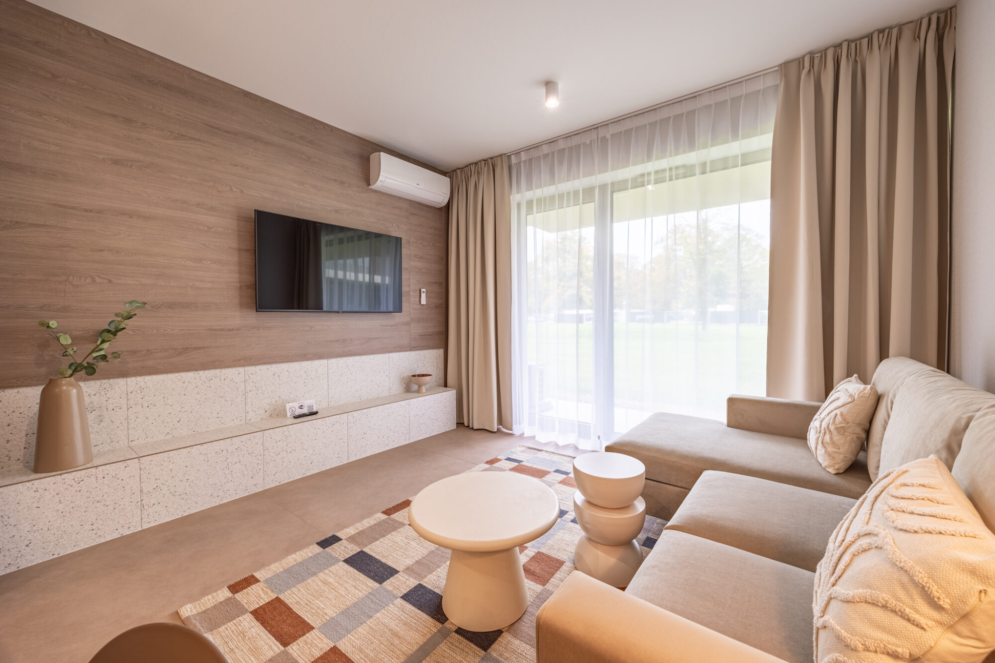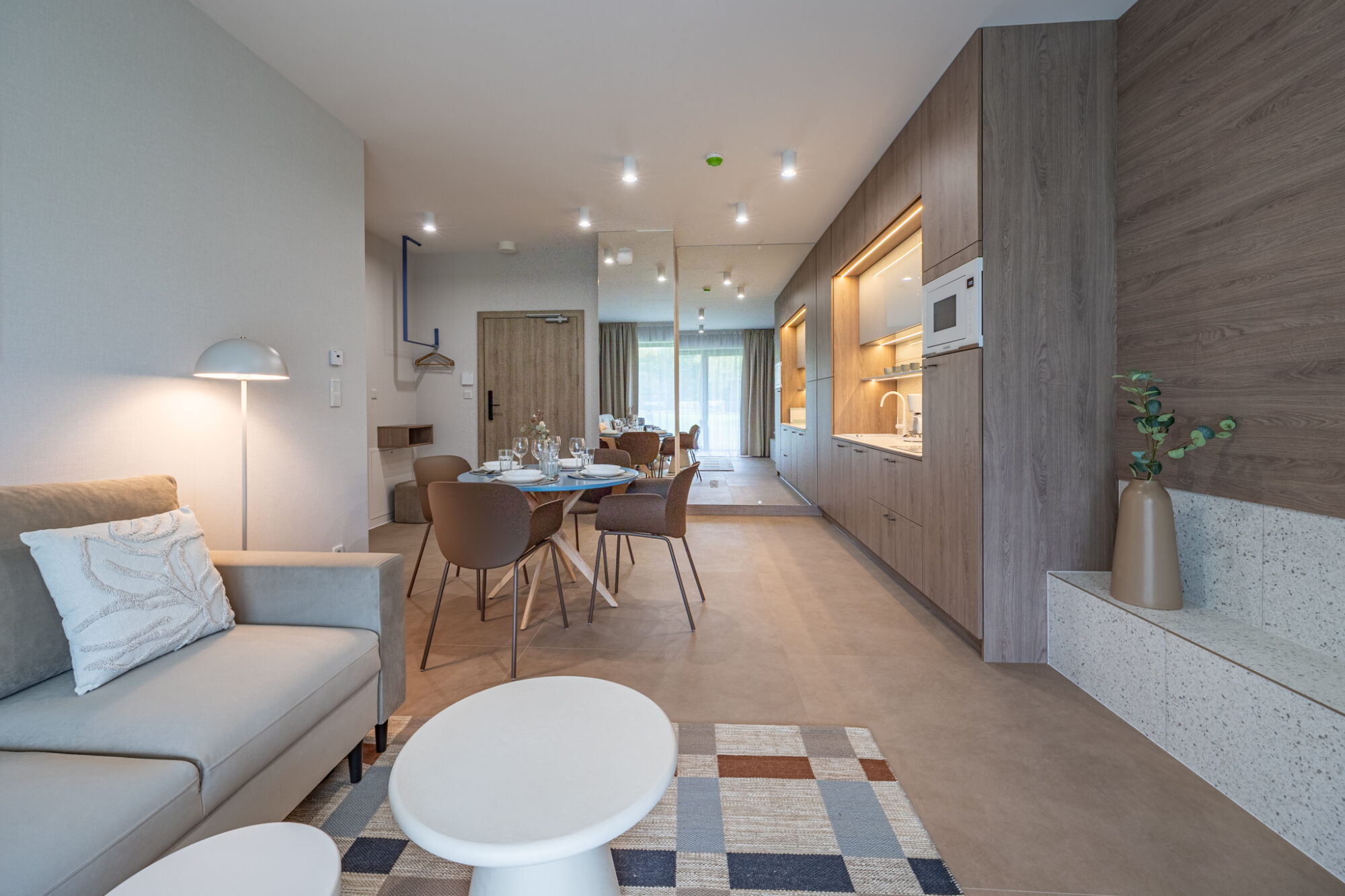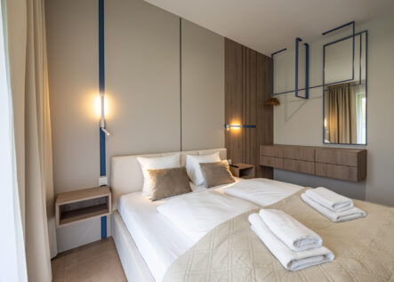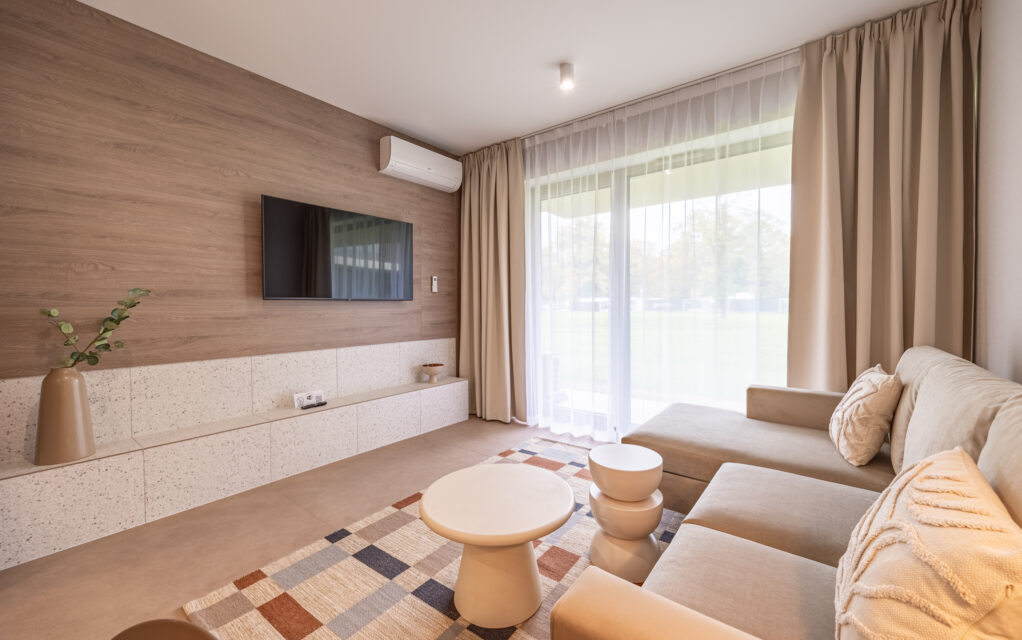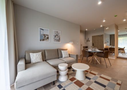Das komfortable, moderne und komplett möblierte Apartment bietet den idealen Rahmen für einen Familienurlaub. Es besteht aus einem Wohnzimmer mit voll ausgestatteter Küche (Geschirrspüler, Kühlschrank, Backofen, Elektroherd, Wasserkocher, Toaster, Kaffeemaschine etc.), einem Schlafzimmer und einem Badezimmer. Zum Apartment gehört außerdem eine charmante, grüne Terrasse.