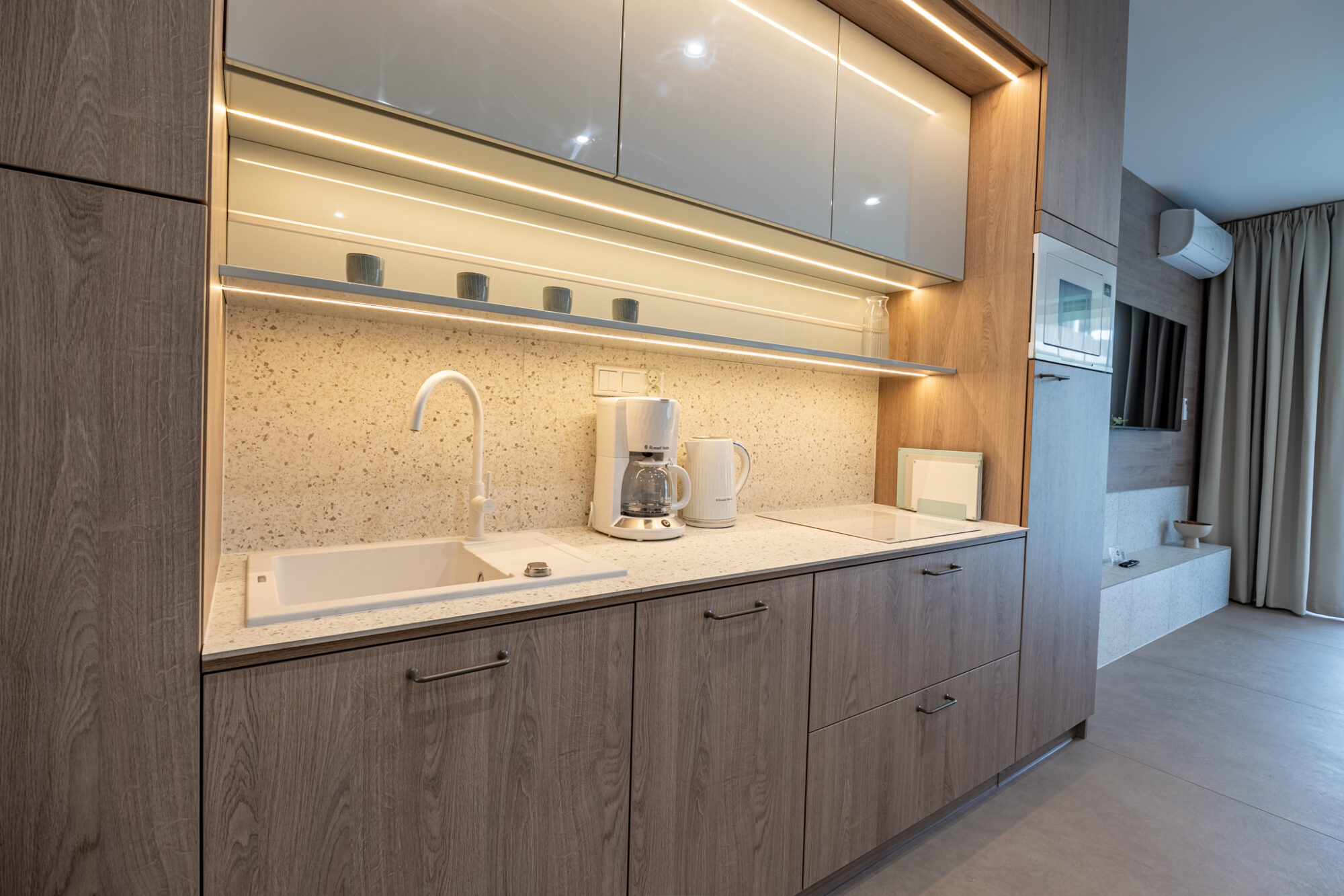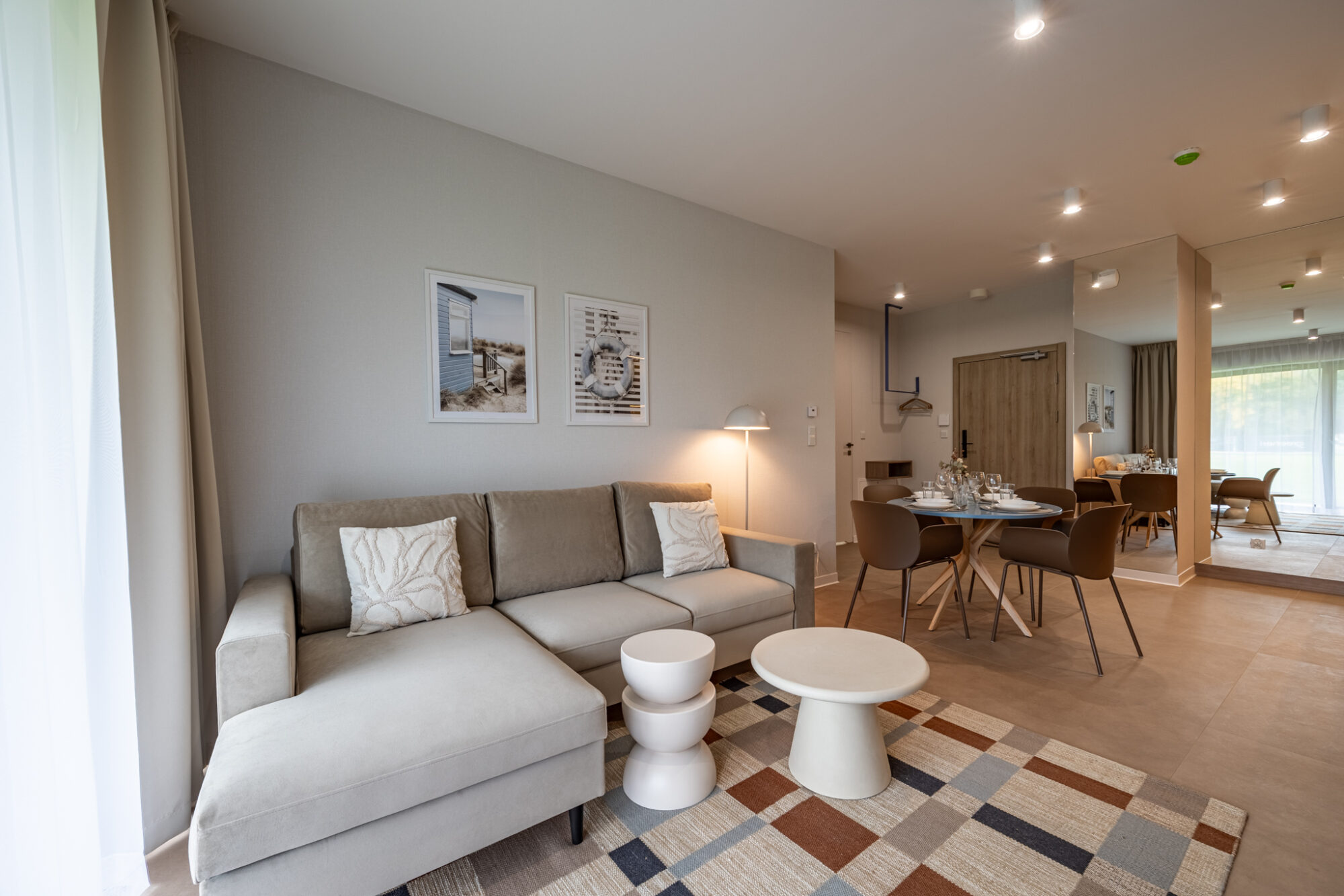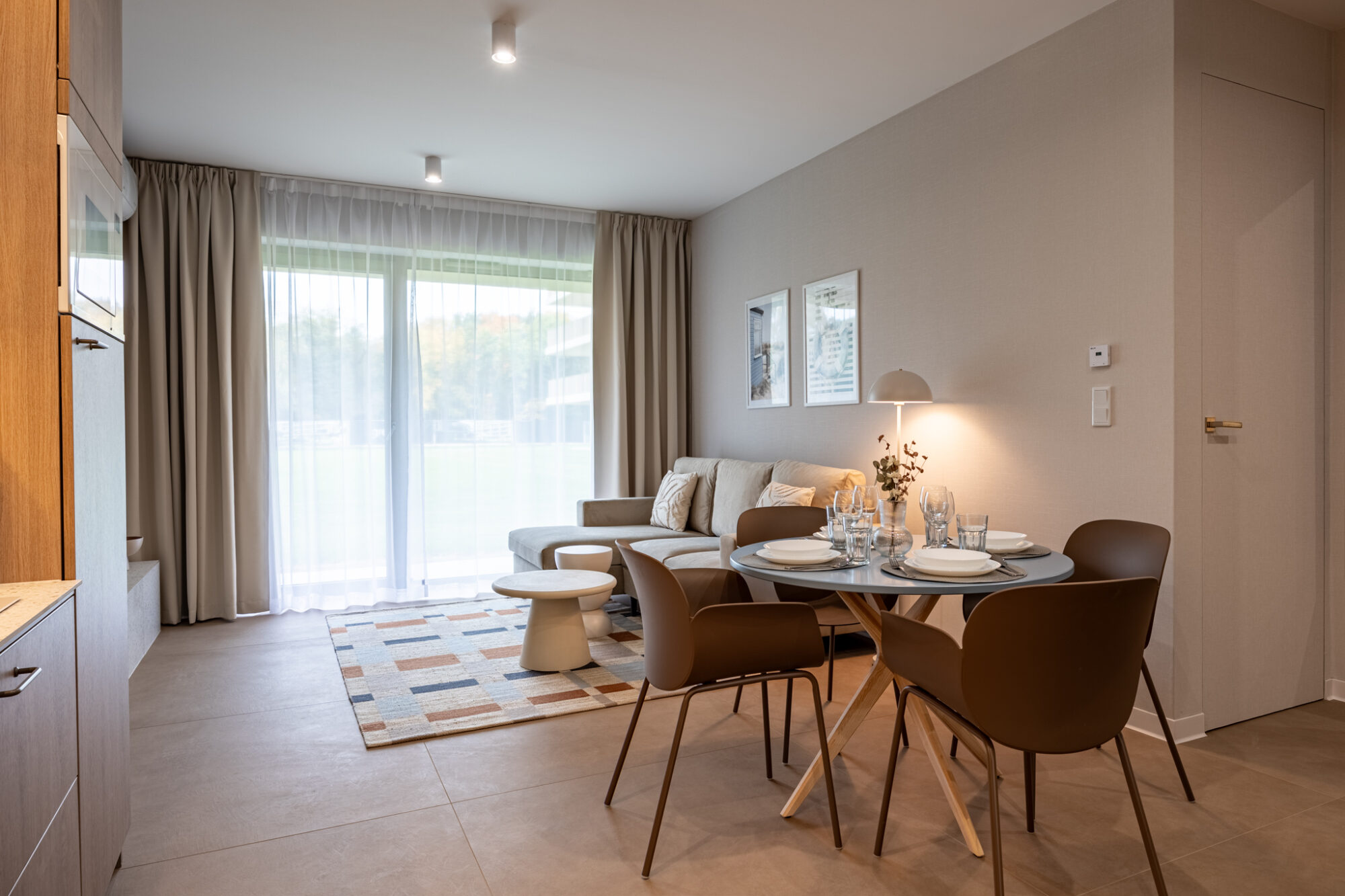 Das komfortable, moderne und komplett möblierte Apartment bietet den idealen Rahmen für einen Familienurlaub. Es besteht aus einem Wohnzimmer mit voll ausgestatteter Küche (Geschirrspüler, Kühlschrank, Backofen, Elektroherd, Wasserkocher, Toaster, Kaffeemaschine etc.), einem Schlafzimmer und einem Badezimmer. Zum Apartment gehört außerdem eine charmante, grüne Terrasse.
