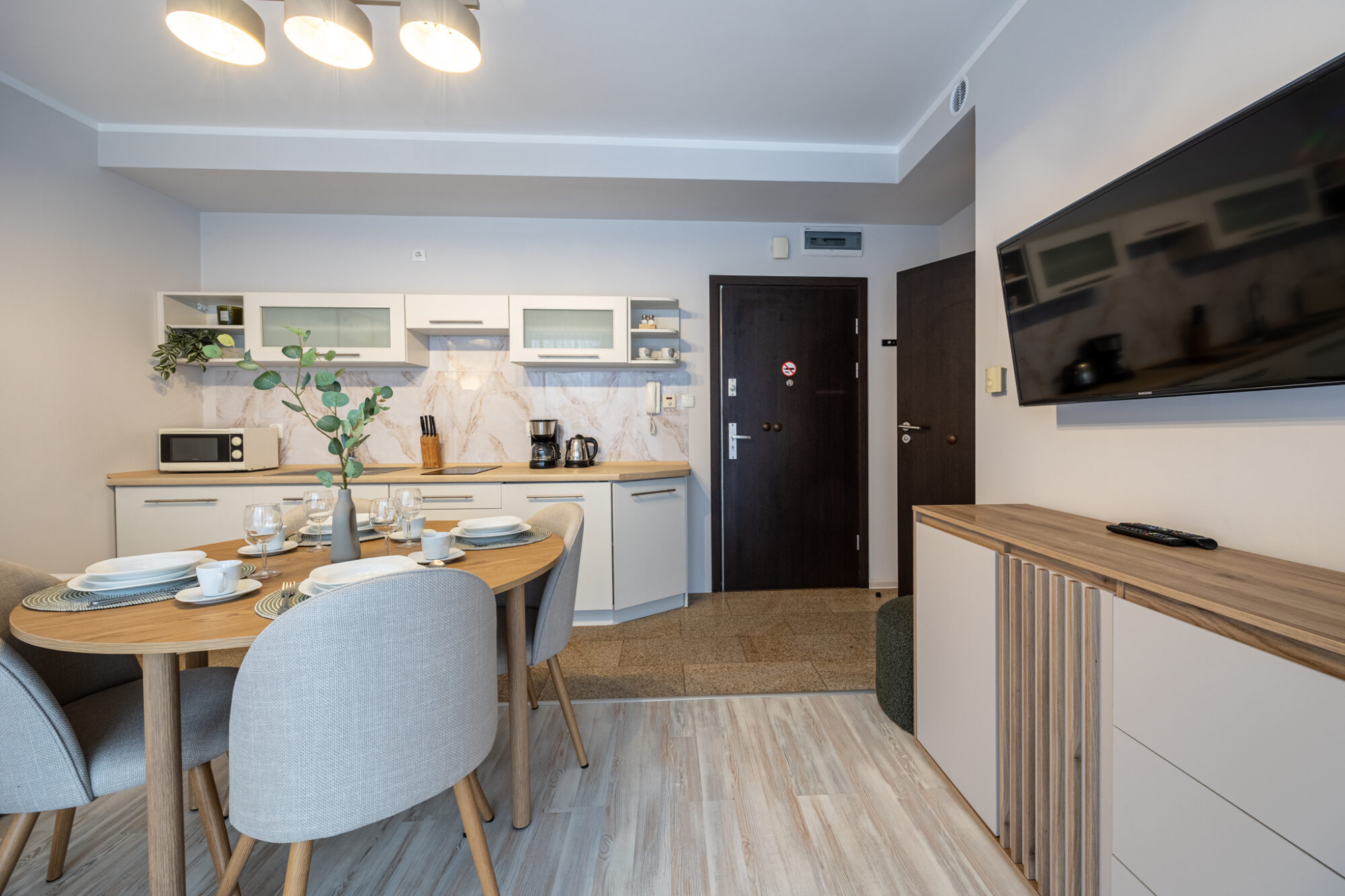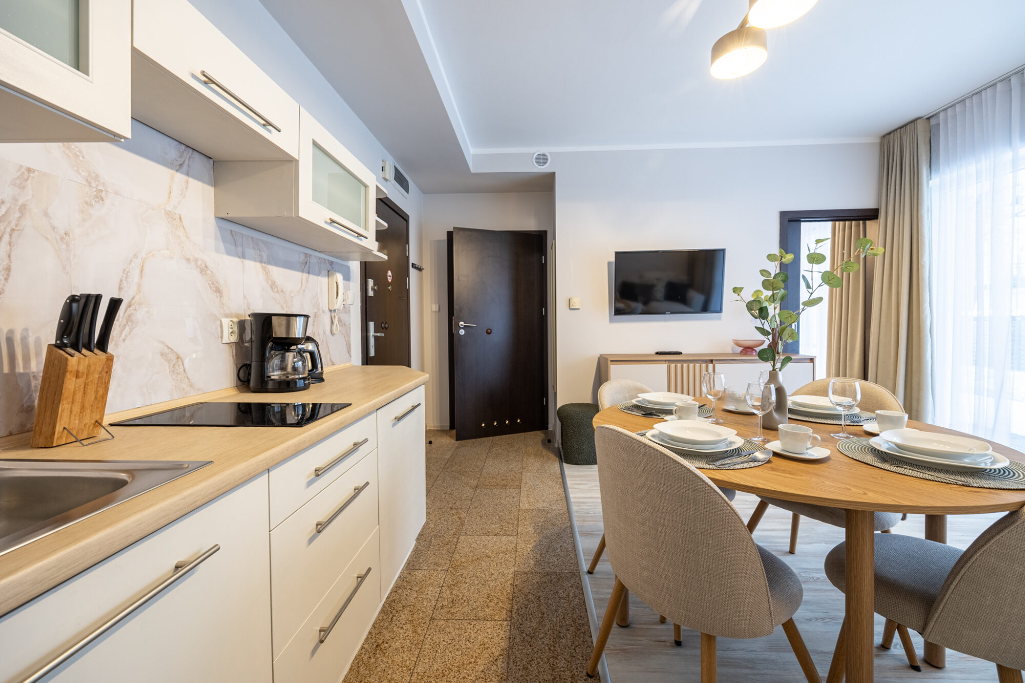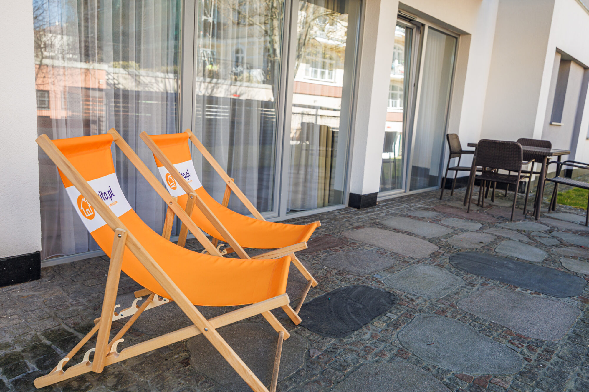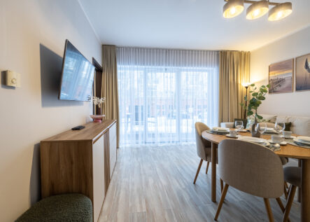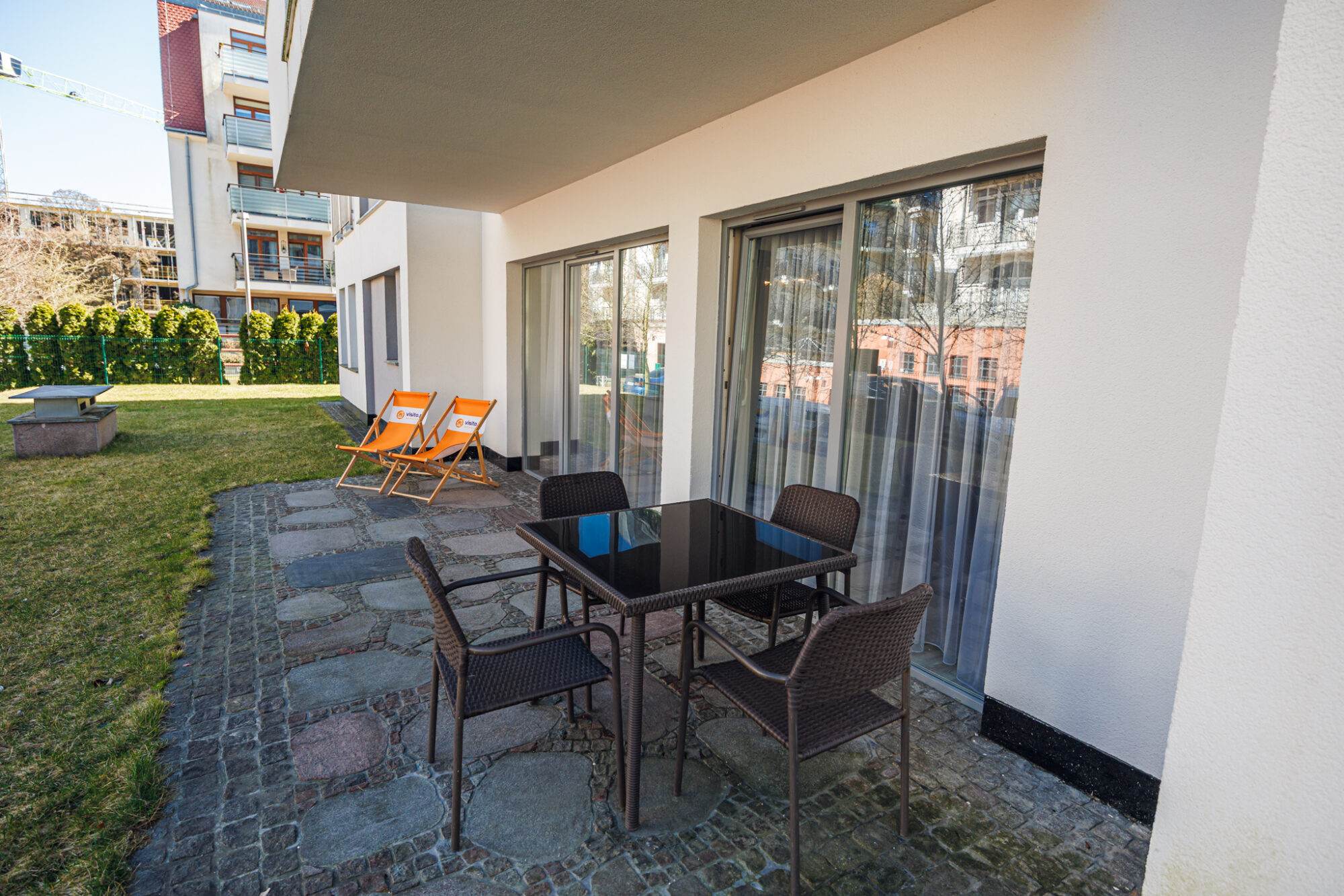 Eine voll ausgestattete Küchenzeile, ein komfortabel eingerichtetes Badezimmer mit Duschkabine, ein Schlafzimmer mit Doppelbett, ein Wohnzimmer mit sofa und ein großzügiger Terrasse machen dieses Apartment komfortabel. Den Gästen stehen digitales Fernsehen und drahtloses Internet zur Verfügung. Ein zusätzlicher Vorteil des Angebots ist seine hervorragende Lage – die Anlage befindet sich an der Promenade, wo sich viele Restaurants, Boutiquen und Cafés befinden.