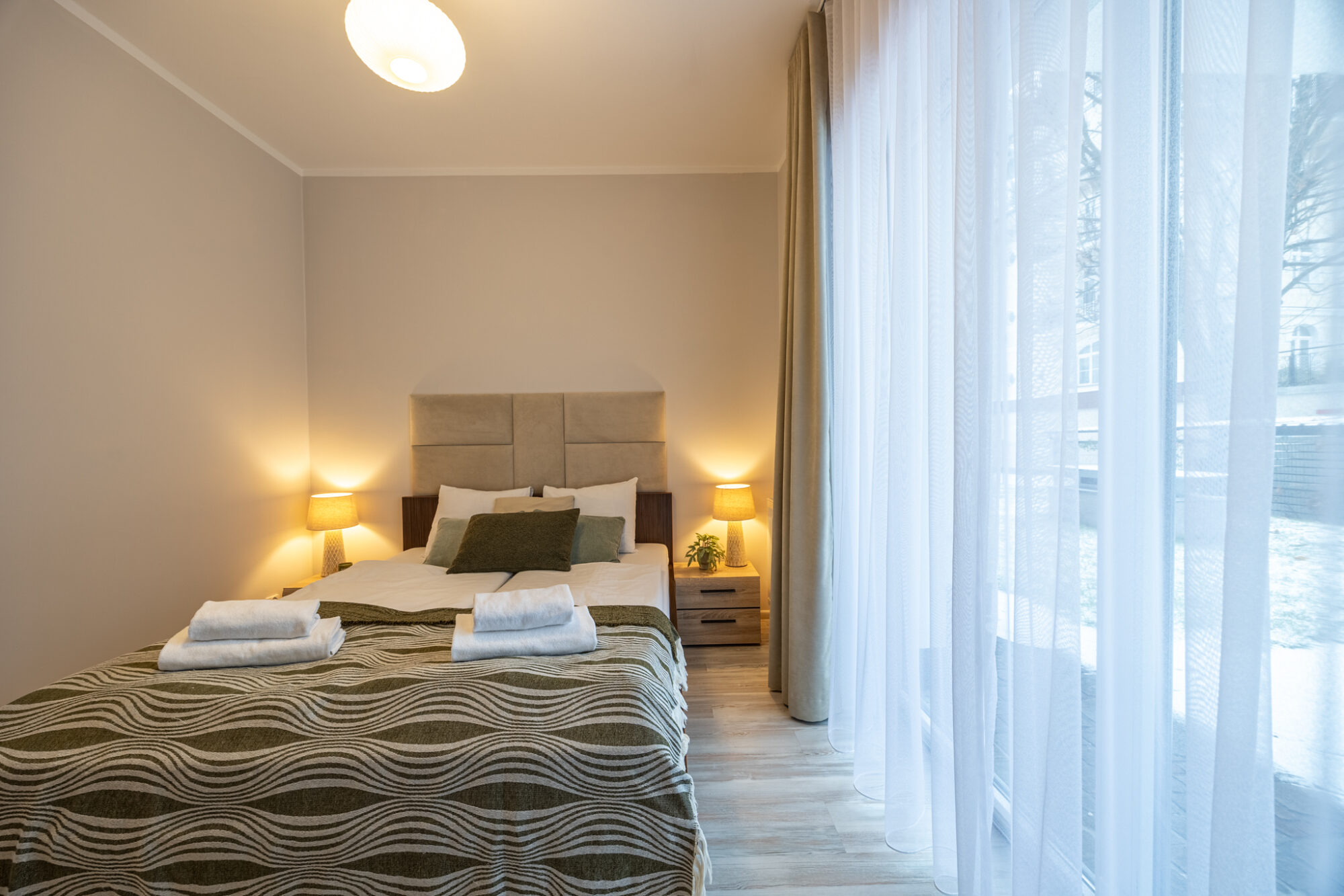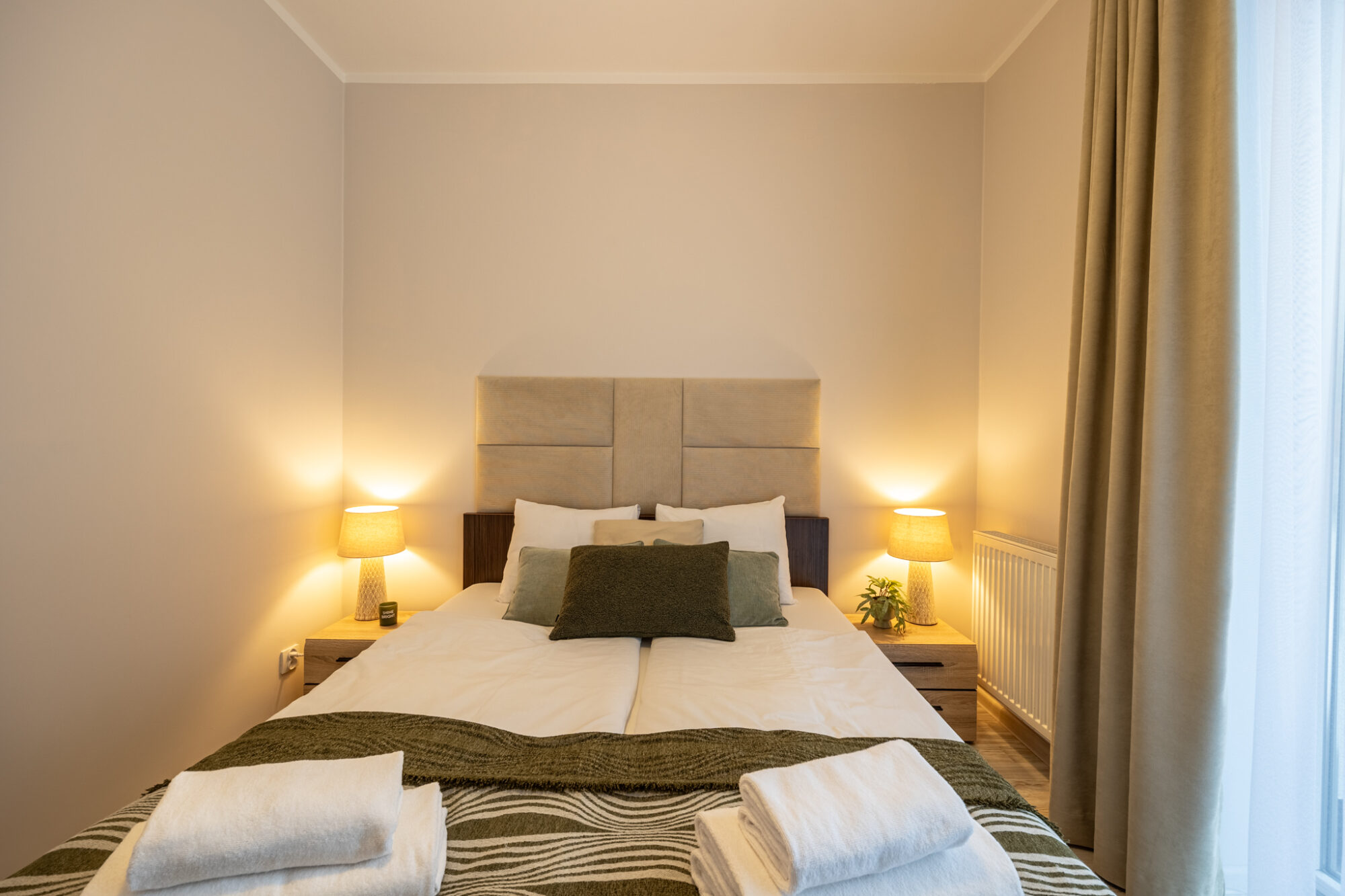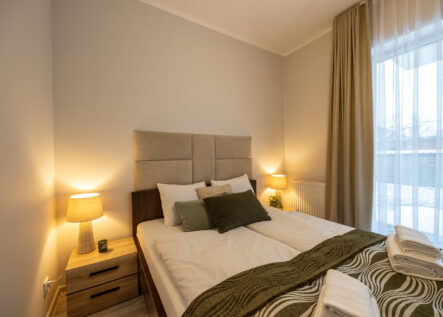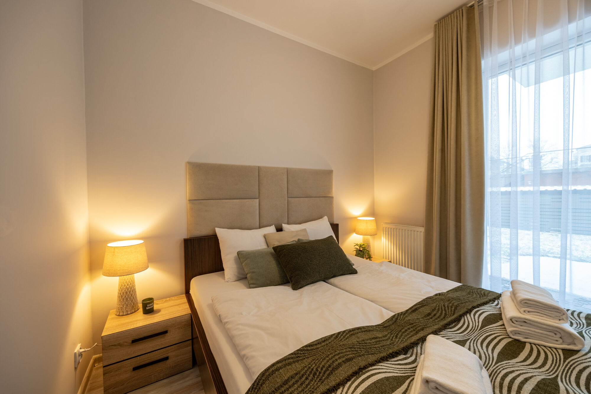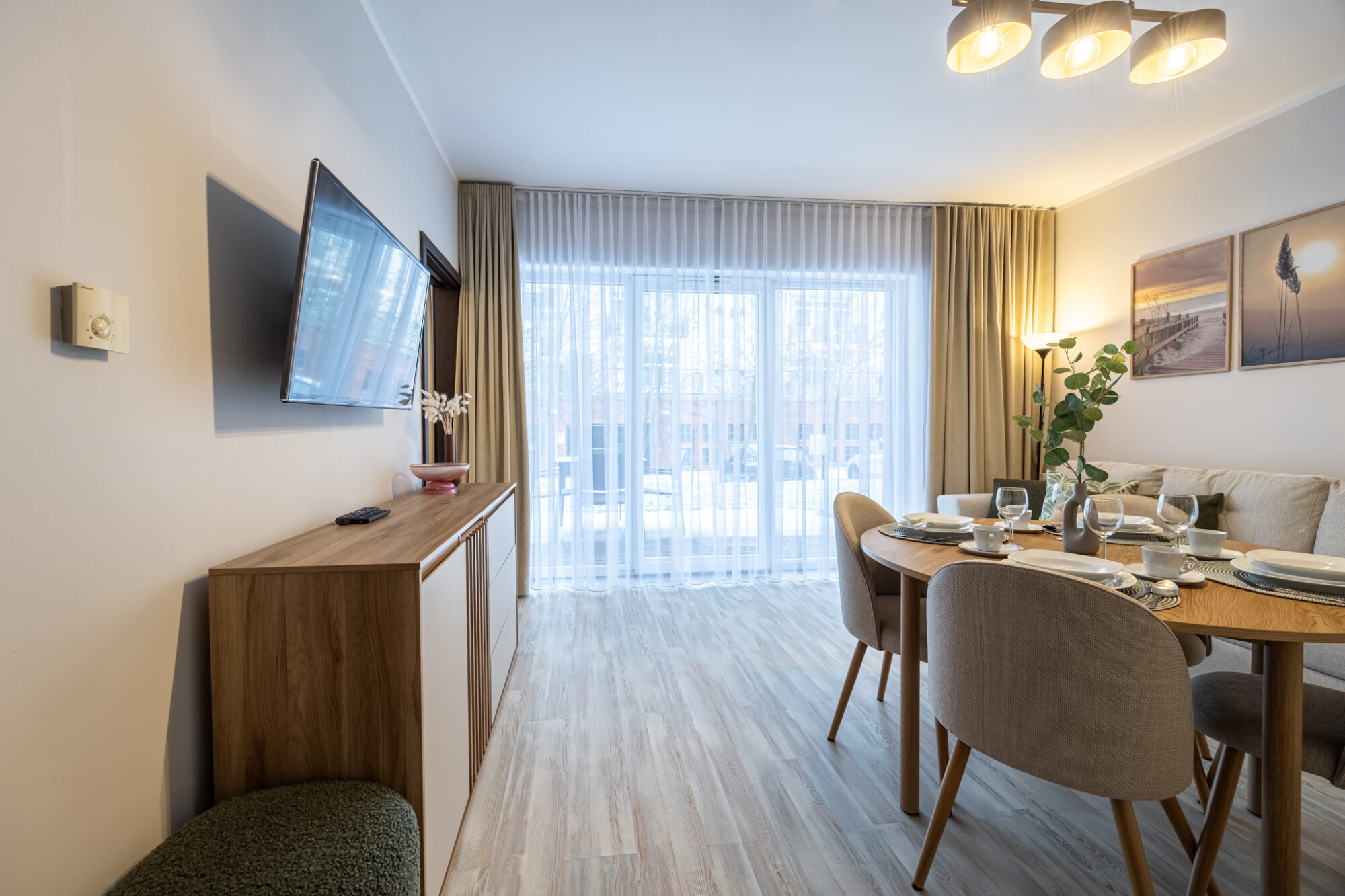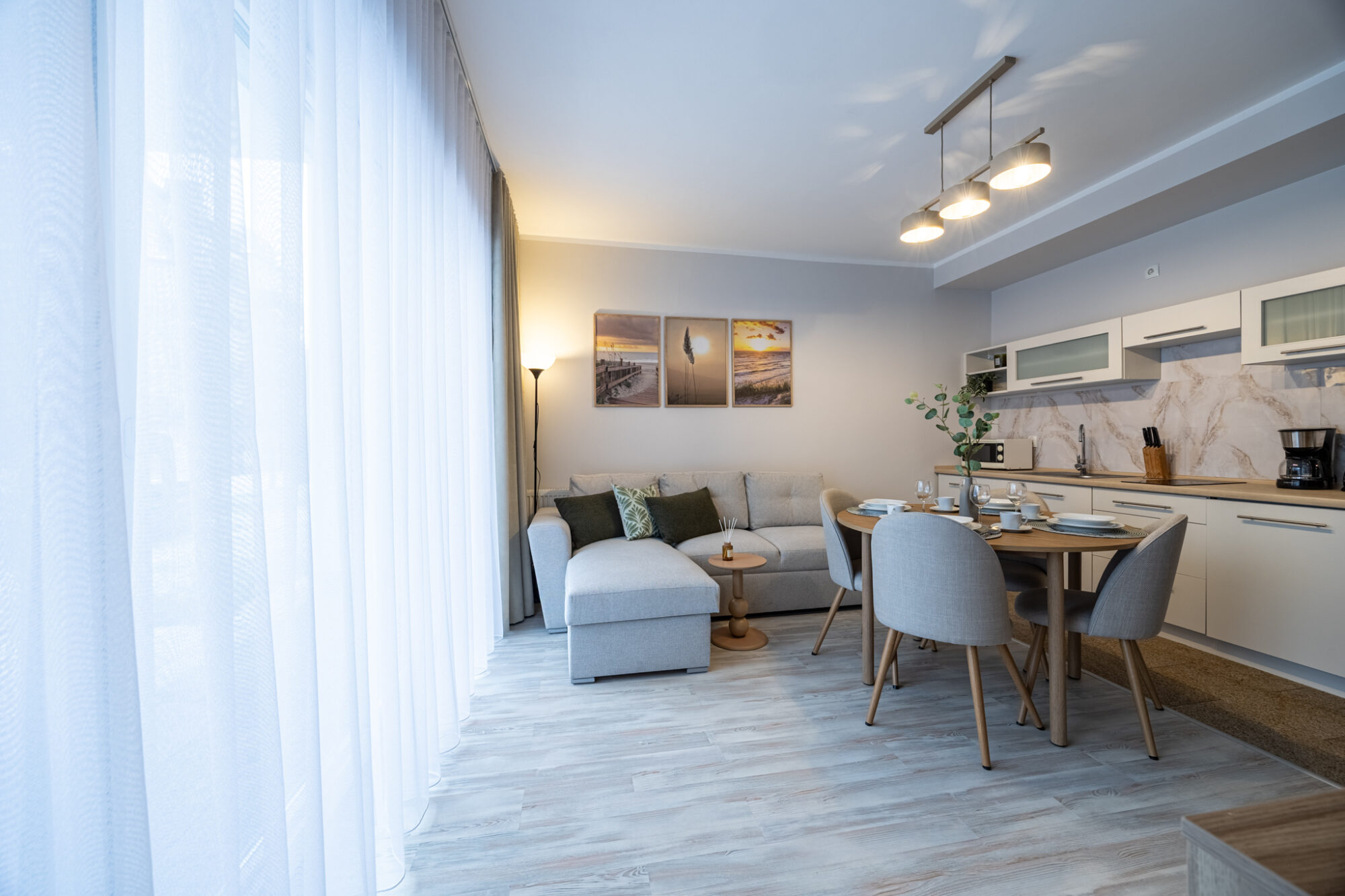 Eine voll ausgestattete Küchenzeile, ein komfortabel eingerichtetes Badezimmer mit Duschkabine, ein Schlafzimmer mit Doppelbett, ein Wohnzimmer mit sofa und ein großzügiger Terrasse machen dieses Apartment komfortabel. Den Gästen stehen digitales Fernsehen und drahtloses Internet zur Verfügung. Ein zusätzlicher Vorteil des Angebots ist seine hervorragende Lage – die Anlage befindet sich an der Promenade, wo sich viele Restaurants, Boutiquen und Cafés befinden.