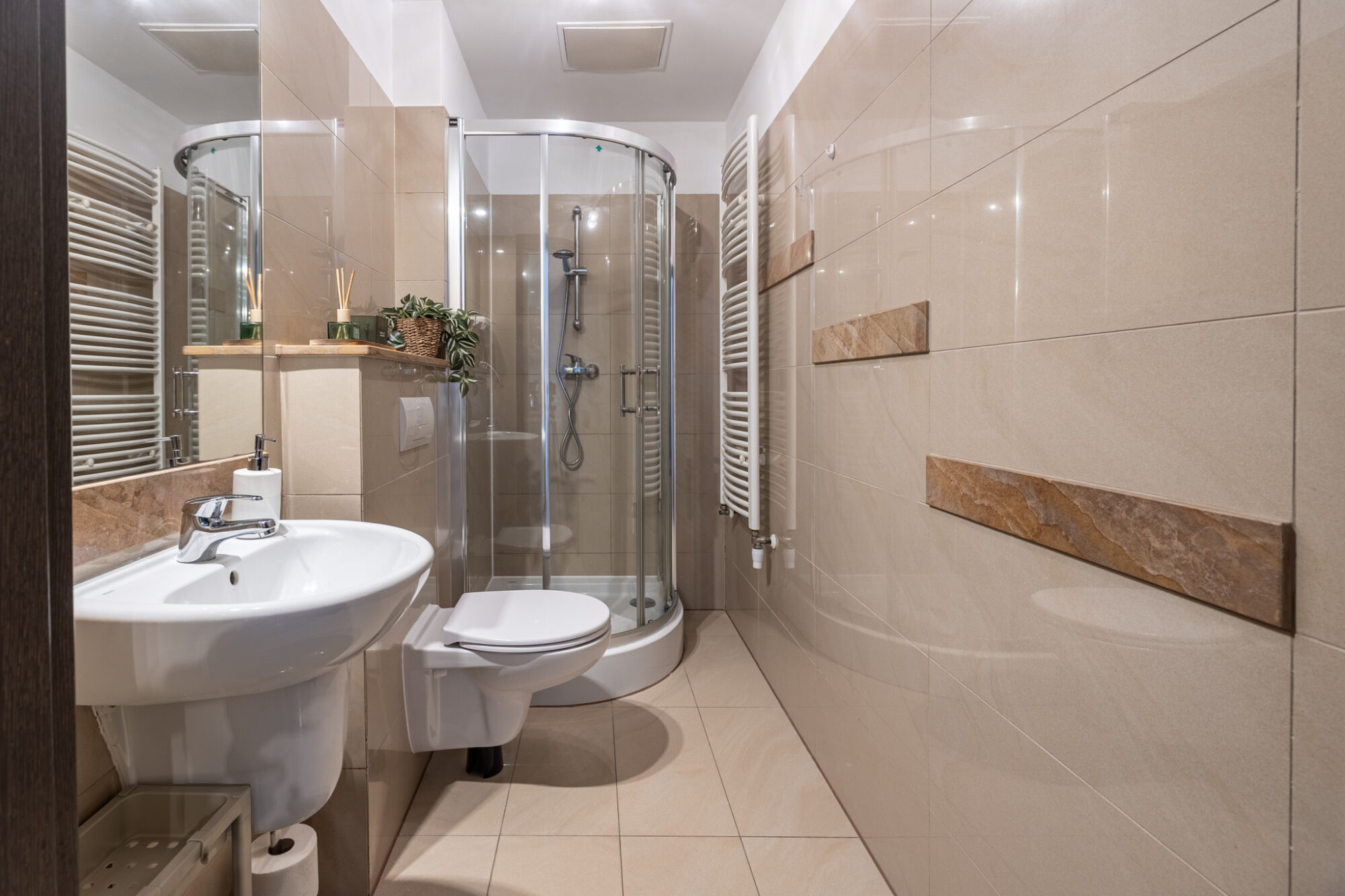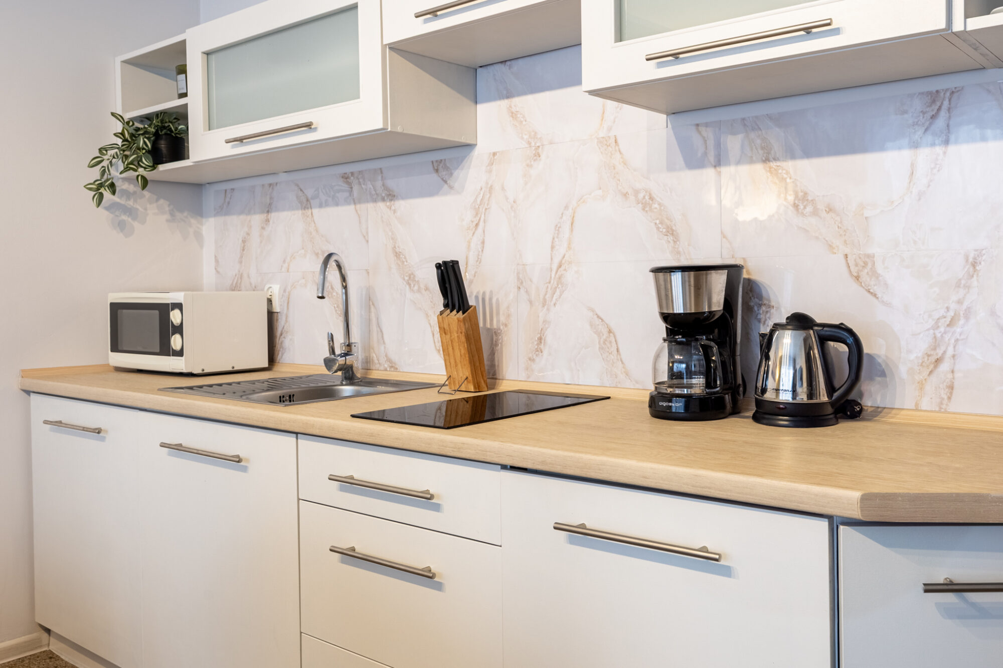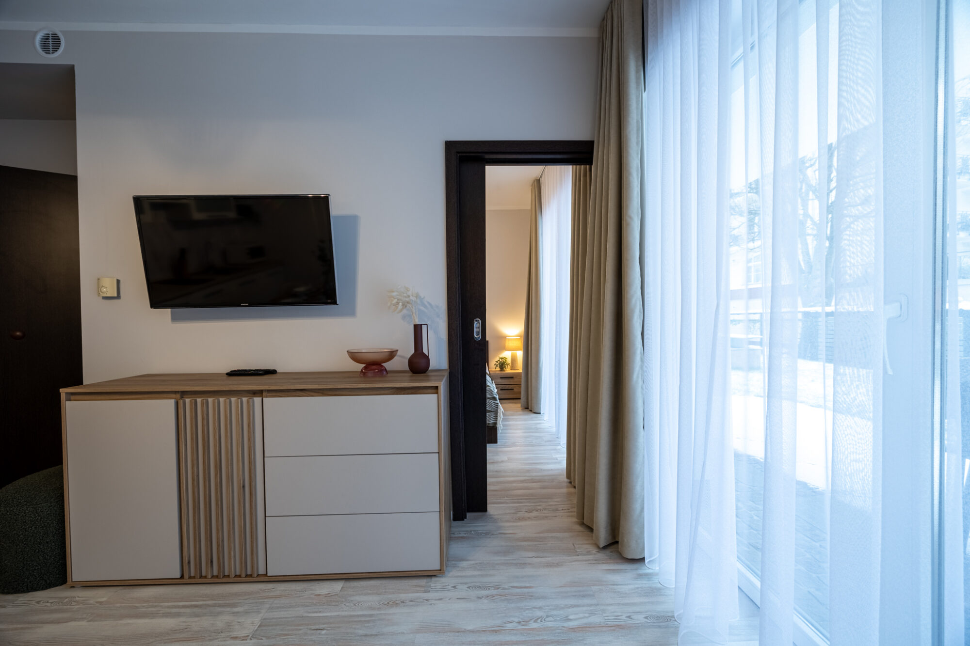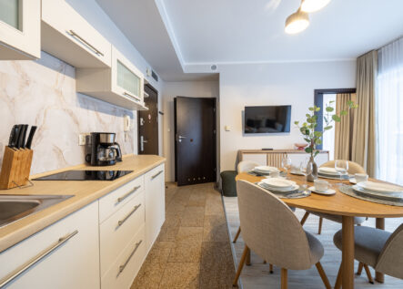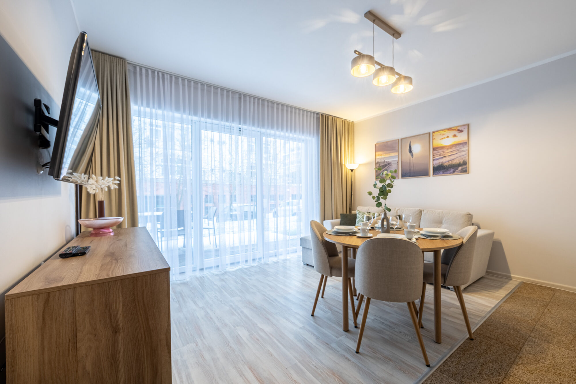 Eine voll ausgestattete Küchenzeile, ein komfortabel eingerichtetes Badezimmer mit Duschkabine, ein Schlafzimmer mit Doppelbett, ein Wohnzimmer mit sofa und ein großzügiger Terrasse machen dieses Apartment komfortabel. Den Gästen stehen digitales Fernsehen und drahtloses Internet zur Verfügung. Ein zusätzlicher Vorteil des Angebots ist seine hervorragende Lage – die Anlage befindet sich an der Promenade, wo sich viele Restaurants, Boutiquen und Cafés befinden.