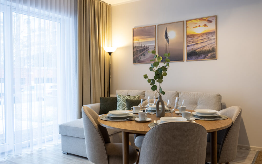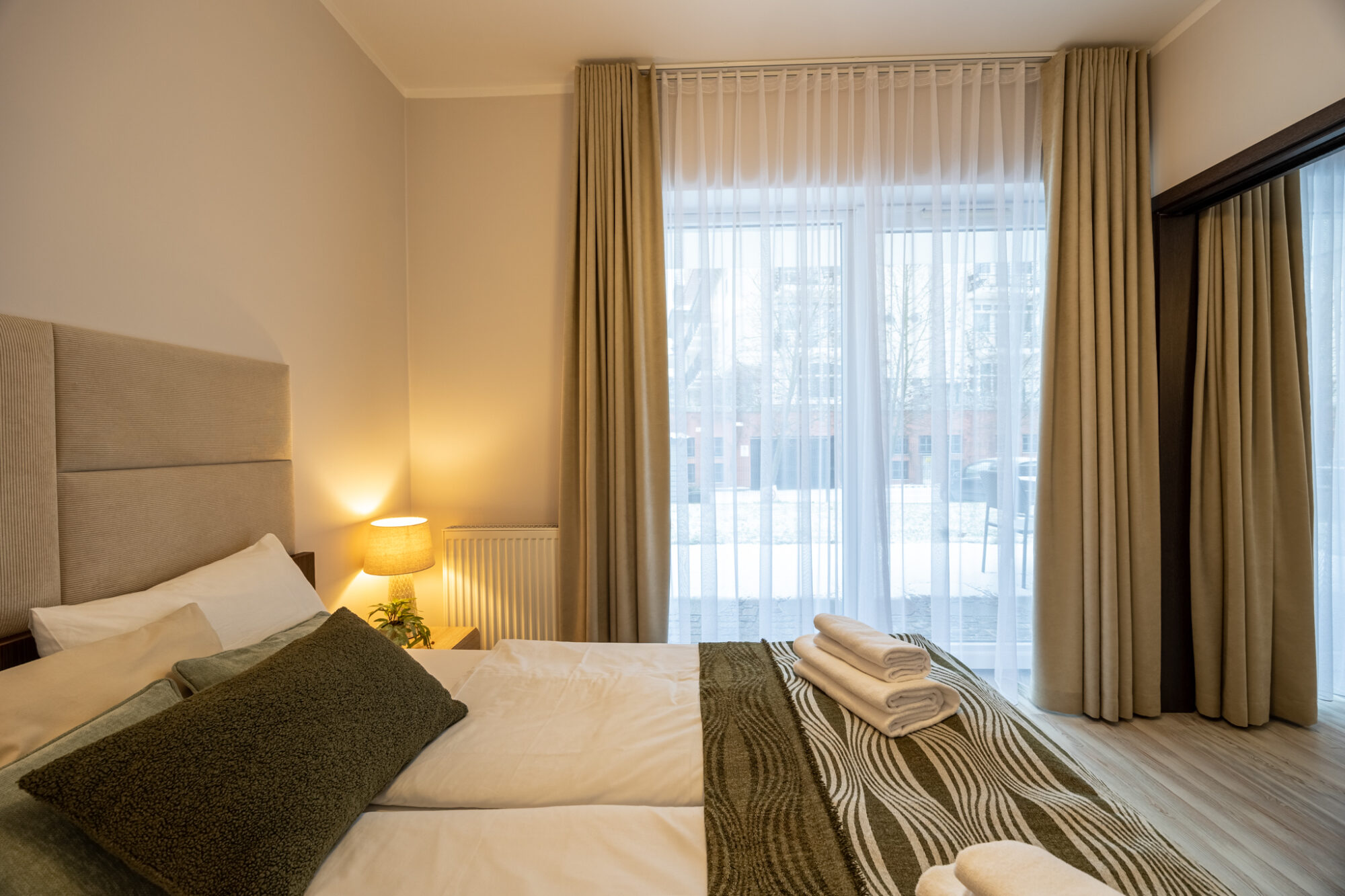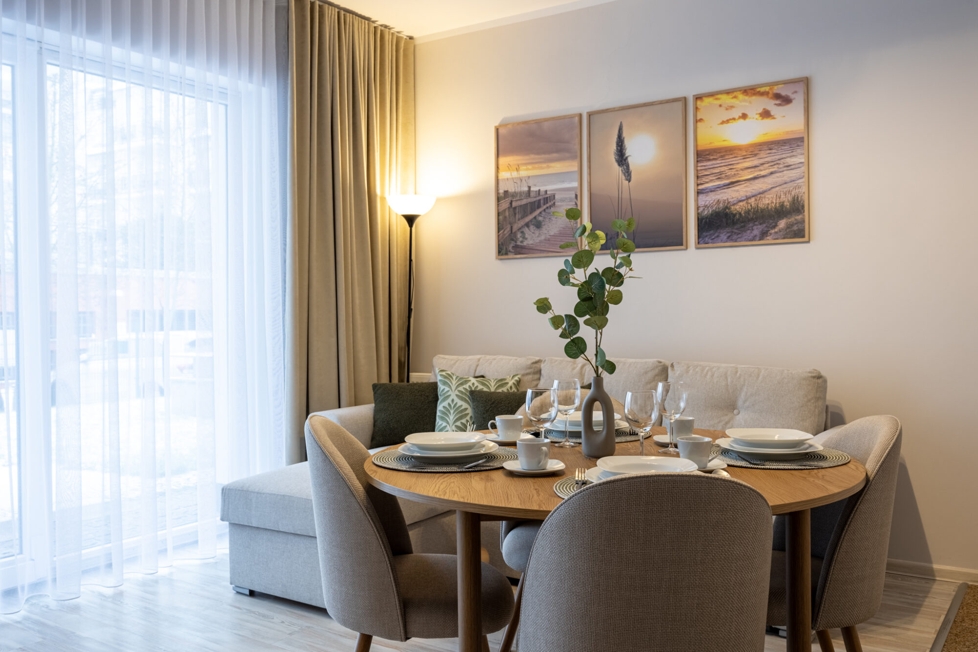 Eine komfortable Zweizimmerwohnung, komplett ausgestattet, die hervorragende Bedingungen zum Entspannen für 3-4 Personen bietet, die eine perfekte Lage mögen. Es befindet sich am Erdgeschoss des modernen Gebäudes Stella Baltic das in einiger Entfernung an der Promenade liegt, 200 m vom Strand entfernt.